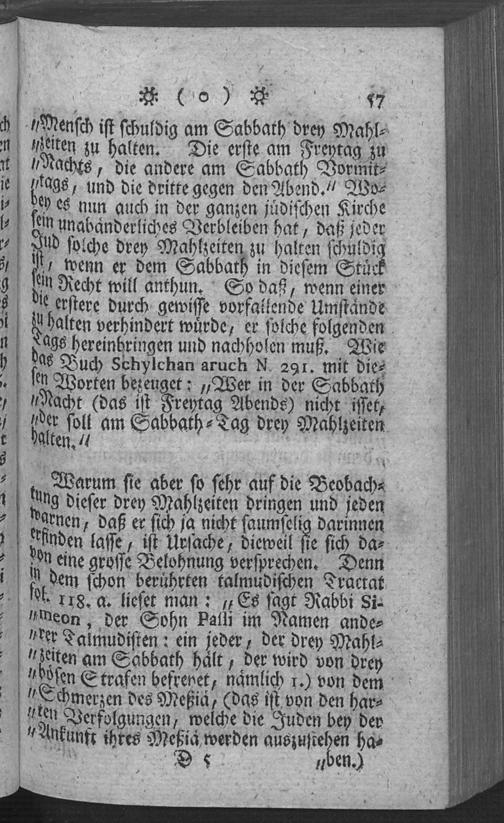 § III. Die besondern Speisen, die ein Jude nun zu Ehren des Sabbaths nach der Verordnung der Rabbinen geniesen soll, wenn er sie aufzutreiben vermag