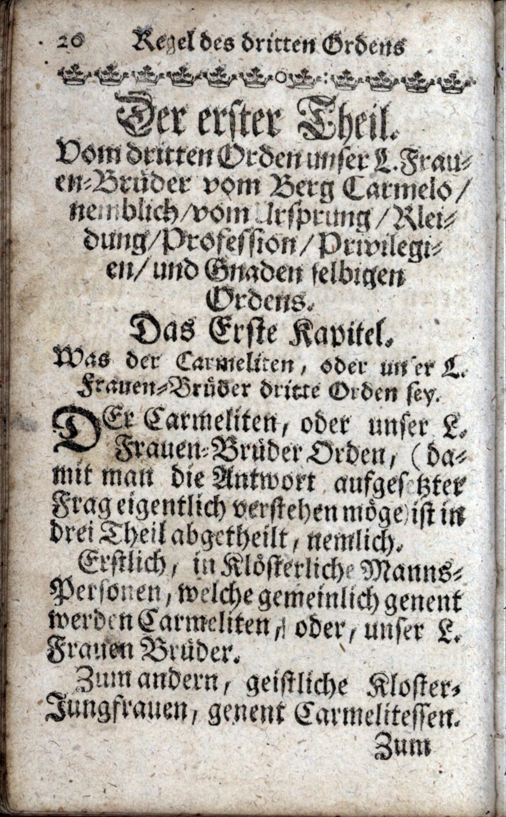 Regul Des dritten Ordens Unser Lieben Frauen Brüder vom Berg Carmelo / Erstlich durch den Ehrwürd. Patrem Danielem à Virgine Maria Ordinis Fratrum Beatiss. Virg. Mariae de Monte Carmelo Provinciae Belgicae Provincialem in Niederländischer Sprach zum Truk verfertigt. Anjetzo aber Auß selbiger durch R. P. F. Carolum à S. Anastasio Ejusdem Ordinis Provinciae Allemaniae Inferioris Priesteren in die Hochteutsche Sprach übersezt