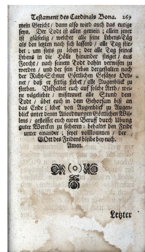 Handleitung zum Himmel Die auserlösneste Lehren H. H. Vätteren, Und Alter Weltweisen, in sich enthaltend / Lateinisch verfasset Durch Joannem, der H. Römisch. Kirchen-Cardinalen Bonam, Des H. Cistercer-Ordens. Nachmals ins Frantzösische übersetzet/ Und mit Beyruckung kurtzen Innhalts/ dessen Lebens-Lauff/ wie auch Testaments oder letzten Willens/ in Druck gegeben/ anjetzo aber aus Lateinisch- und Frantzösischem in reines Teutsche gestellet, auch mit einigen Anmerckungen vermehret von P. Friderico Falzeder, Professen in dem hoch-löbl. Stüfft, und Closter Crembsmünster/ auch der Zeit vorgestellten Seelsorgern der Pfarr ad S. Udalricum in Eberstallzell