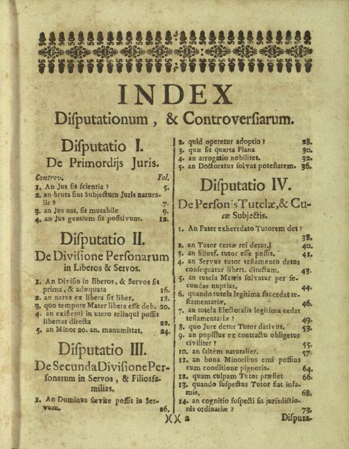Disputationes Juridicæ Super Præcipuis Juris Justinianæi Controversijs : Ad Faciliorem SS. Canonum Intellectum, & Disputantium Utilitatem Concinnatæ / à P. Remigio à S. Erasmo Religionis Clericorum Regularium Pauperum Matris Dei Scholarum Piarum Professo SS. Canonum Professore actuali, & eodem Præside publicè propugnata à P. Ludovico à S. Anna ejusdem Religionis Sacerdote Professo SS. Canonum Auditore. In Cardinalitio-Dietrichsteiniano Scholarum Piarum Collegio Nicolspurgi Anno Domini 1732. Mense Augusto Die