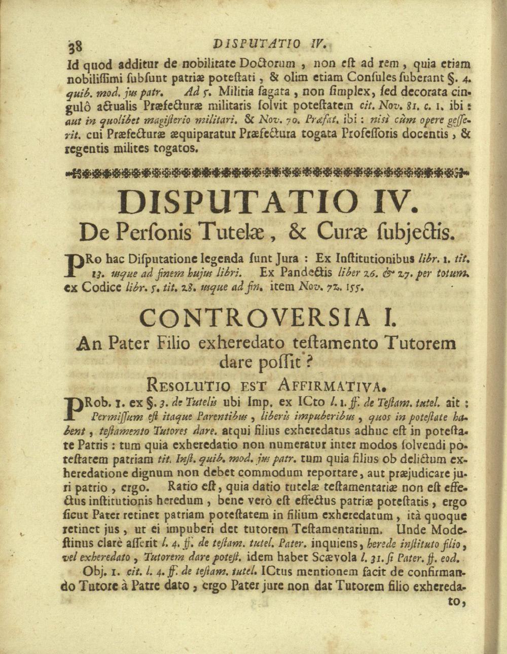 Disputationes Juridicæ Super Præcipuis Juris Justinianæi Controversijs : Ad Faciliorem SS. Canonum Intellectum, & Disputantium Utilitatem Concinnatæ / à P. Remigio à S. Erasmo Religionis Clericorum Regularium Pauperum Matris Dei Scholarum Piarum Professo SS. Canonum Professore actuali, & eodem Præside publicè propugnata à P. Ludovico à S. Anna ejusdem Religionis Sacerdote Professo SS. Canonum Auditore. In Cardinalitio-Dietrichsteiniano Scholarum Piarum Collegio Nicolspurgi Anno Domini 1732. Mense Augusto Die
