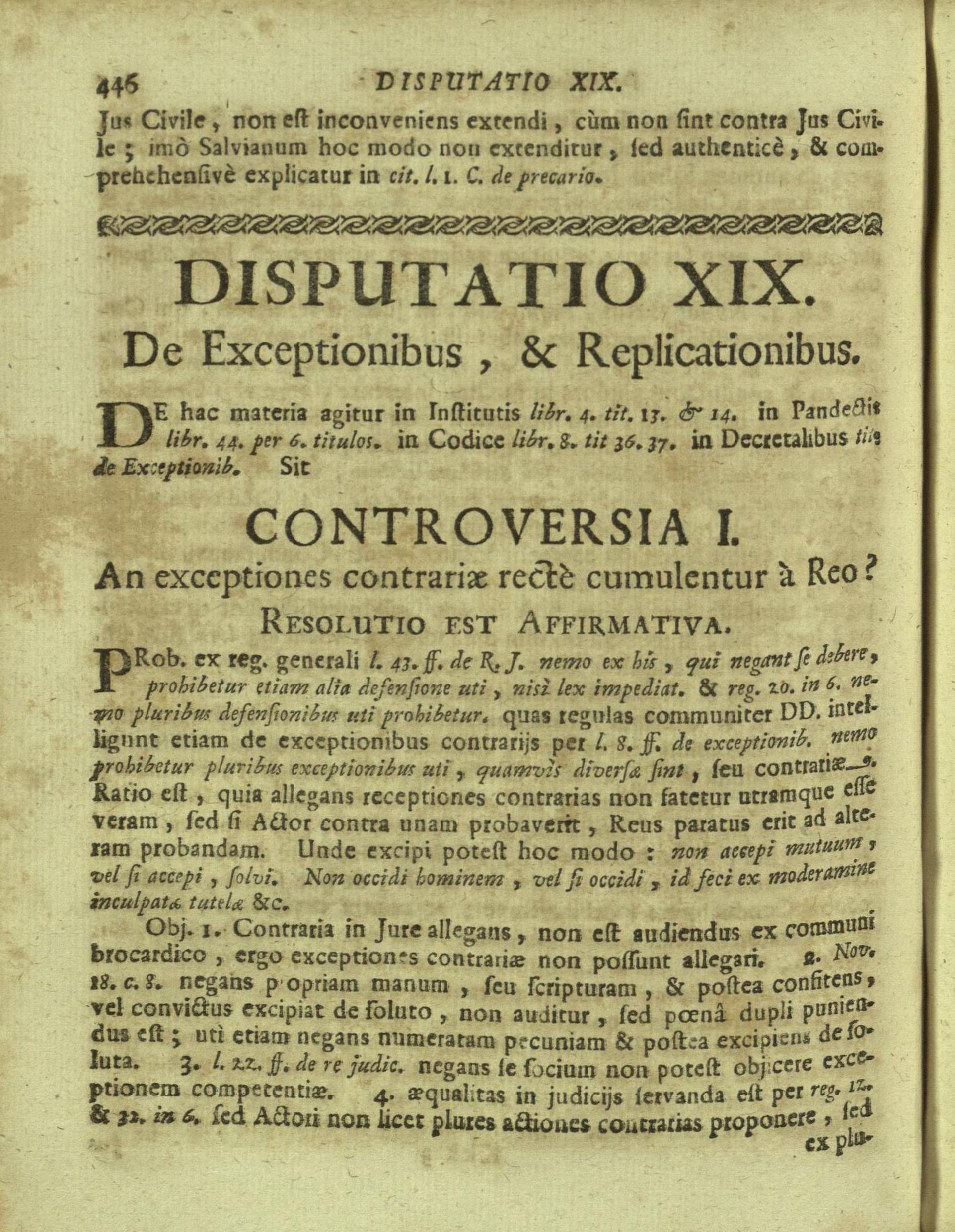 Disputationes Juridicæ Super Præcipuis Juris Justinianæi Controversijs : Ad Faciliorem SS. Canonum Intellectum, & Disputantium Utilitatem Concinnatæ / à P. Remigio à S. Erasmo Religionis Clericorum Regularium Pauperum Matris Dei Scholarum Piarum Professo SS. Canonum Professore actuali, & eodem Præside publicè propugnata à P. Ludovico à S. Anna ejusdem Religionis Sacerdote Professo SS. Canonum Auditore. In Cardinalitio-Dietrichsteiniano Scholarum Piarum Collegio Nicolspurgi Anno Domini 1732. Mense Augusto Die