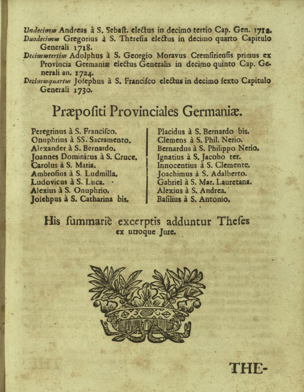 Relationes Historico-Canonicæ De Instituto Clericorum Regularium Pauperum Matris Dei Scholarum Piarum Pro Anno Sæculari Collegii Nicolspurgensis : Ad Modum Reverendo, Ac Religiosissimo P. Basilio á S. Antonio per Germaniam Præposito Provinciali A R. P. Alexio à S. Andrea Rectori R. P. Ignatio à S. Jacobo Ex-Assistenti Generali R. P. Joachimo à S. Adalberto Ex-Provinciali R. P. Casimiro à S. Bartholomæo Vice-Rectori totíque Religiosæ Familiæ Nicolspurgensi in submissæ venerationis, & gratulationis signum oblatæ / à Canonistis Nicolspurgensibus PP. Ludovico à S. Anna, Narcisso à S. Rosa, Florido à S. Hiacyntho, Venantio à S. Huberto, Sigismundo à S. Ludovico, & Antonio à S. Patritio cum annexis Thesibus ex utroque Jure ab ijsdem propugnandis Præside P. Remigio à S. Erasmo, Ejusdem Instituti Professo, & SS. Canonum Professore actuali In eodem Cardinalitio-Dietrichsteiniano Scholarum Piarum Collegio an. 1731. Junio Die