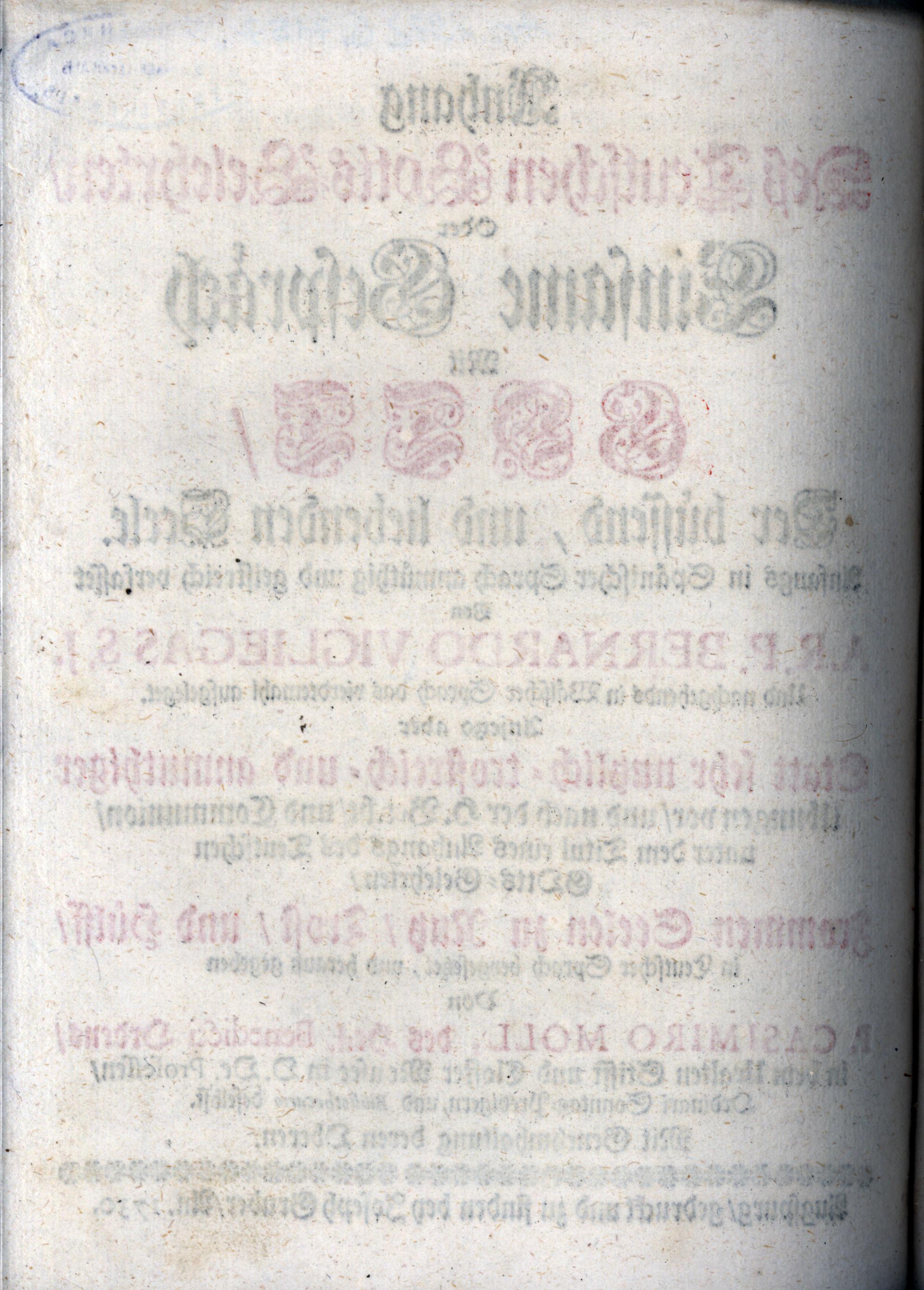Anhang Deß Teutschen Gotts-Gelehrten/ Oder Einsame Gespräch Mit Gott/ Der büssend, und liebenden Seele / Anfangs in Spanischer Sprach anmüthig und geistreich verfasset Von A. R. P. Bernardo Vigliegas S.J. Und nachgehends in Wälscher Sprach das vierdtemahl aufgeleget. Anjetzo aber Statt sehr nutzlich- trostreich- und anmuthiger Ubungen vor/ und nach der H. Beicht/ und Communion/ unter dem Titul eines Anhangs des Teutschen Gotts-Gelehrten/ Frommen Seelen zu Nutz/ Trost/ und Hülff/ in Teutscher Sprach beygesetzet, und herauß gegeben Von P. Casimiro Moll, des Heil. Benedicti Ordens/ in dem Uralten Stifft und Closter Monsee in O. Oe. Professen/ Ordinari Sonntag-Predigern, und Bibliothecario daselbst