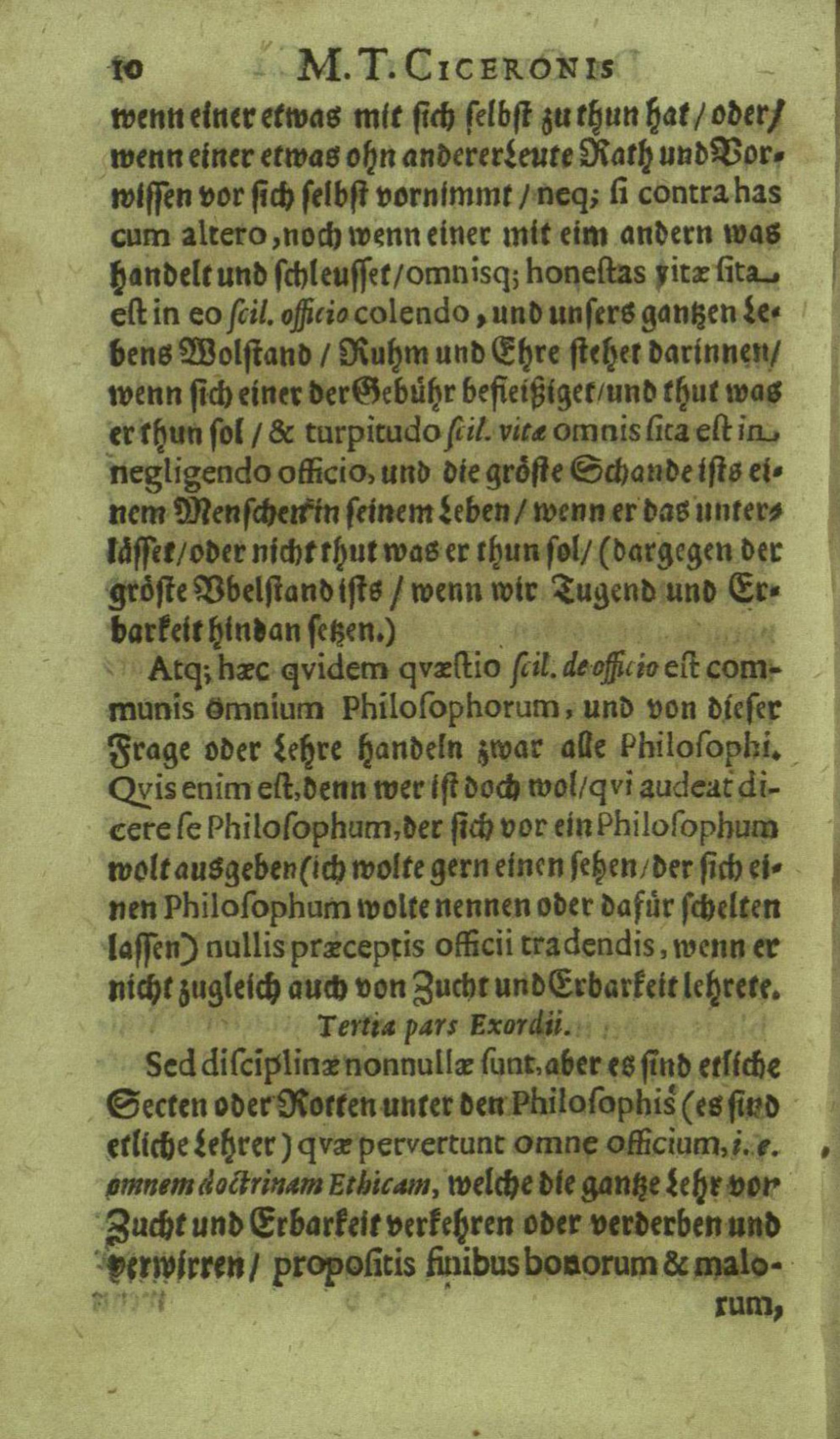 M. Tullii Ciceronis De Officiis, Id est: De vita, moribus, consiliis & actionibus hominis rectè conformandis & regendis Ad Marcum Filium : Libri Tres / Ab innumeris vulgarium editionem mendis crassissimis liberati, & in gratiam & commoditatem studiosae juventutis interpretatione germanicâ perspicuâ & fideli expositi à M. Johanne Rhenio
