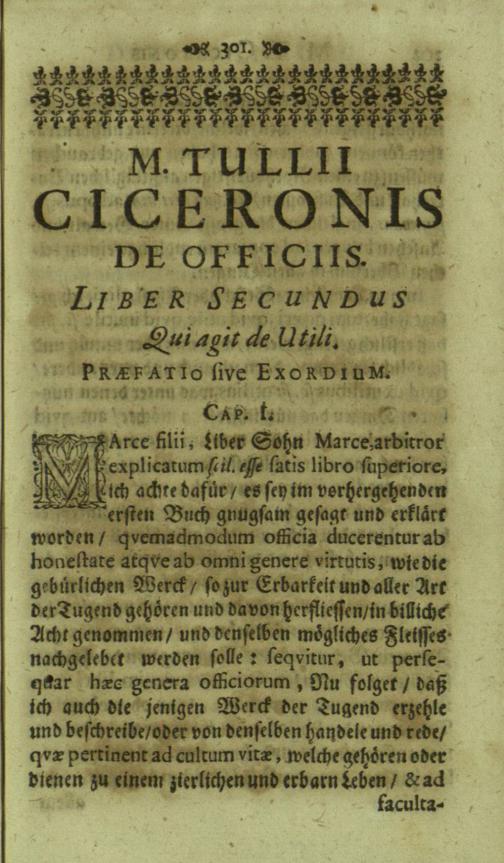 M. Tullii Ciceronis De Officiis, Id est: De vita, moribus, consiliis & actionibus hominis rectè conformandis & regendis Ad Marcum Filium : Libri Tres / Ab innumeris vulgarium editionem mendis crassissimis liberati, & in gratiam & commoditatem studiosae juventutis interpretatione germanicâ perspicuâ & fideli expositi à M. Johanne Rhenio