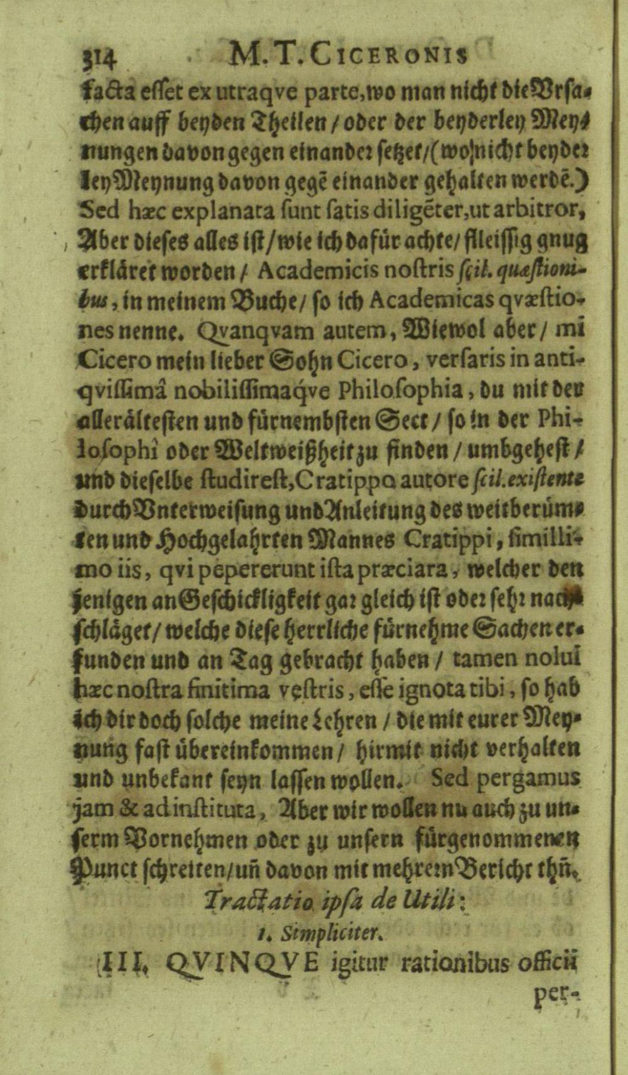 M. Tullii Ciceronis De Officiis, Id est: De vita, moribus, consiliis & actionibus hominis rectè conformandis & regendis Ad Marcum Filium : Libri Tres / Ab innumeris vulgarium editionem mendis crassissimis liberati, & in gratiam & commoditatem studiosae juventutis interpretatione germanicâ perspicuâ & fideli expositi à M. Johanne Rhenio