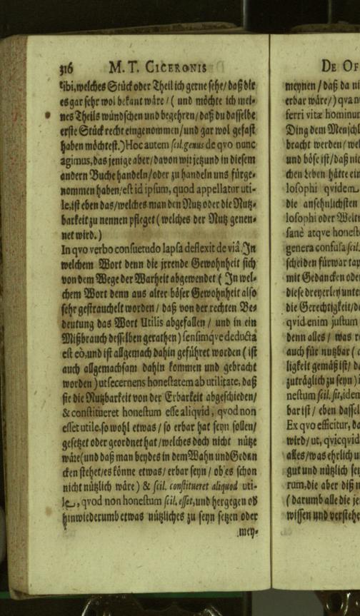 M. Tullii Ciceronis De Officiis, Id est: De vita, moribus, consiliis & actionibus hominis rectè conformandis & regendis Ad Marcum Filium : Libri Tres / Ab innumeris vulgarium editionem mendis crassissimis liberati, & in gratiam & commoditatem studiosae juventutis interpretatione germanicâ perspicuâ & fideli expositi à M. Johanne Rhenio