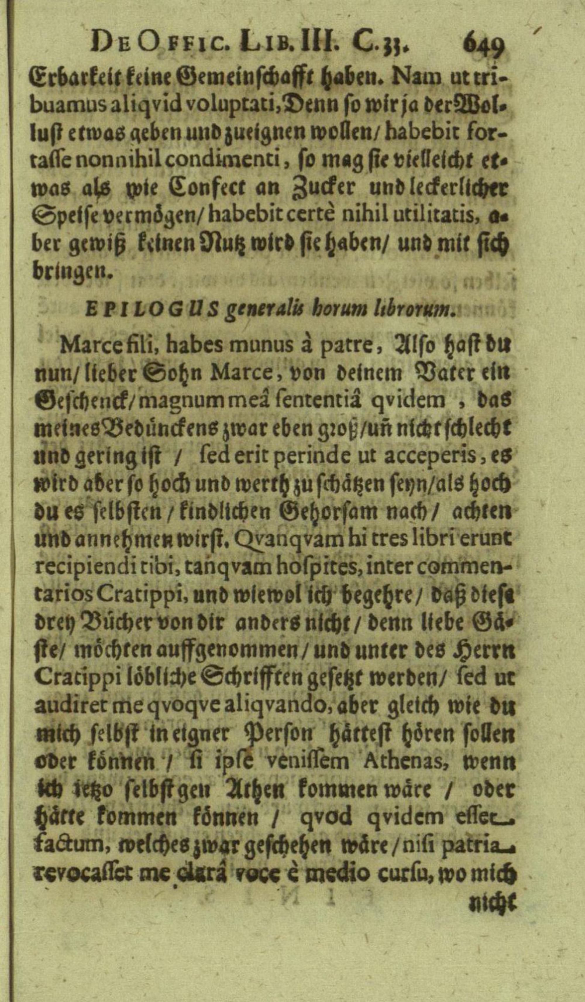 M. Tullii Ciceronis De Officiis, Id est: De vita, moribus, consiliis & actionibus hominis rectè conformandis & regendis Ad Marcum Filium : Libri Tres / Ab innumeris vulgarium editionem mendis crassissimis liberati, & in gratiam & commoditatem studiosae juventutis interpretatione germanicâ perspicuâ & fideli expositi à M. Johanne Rhenio