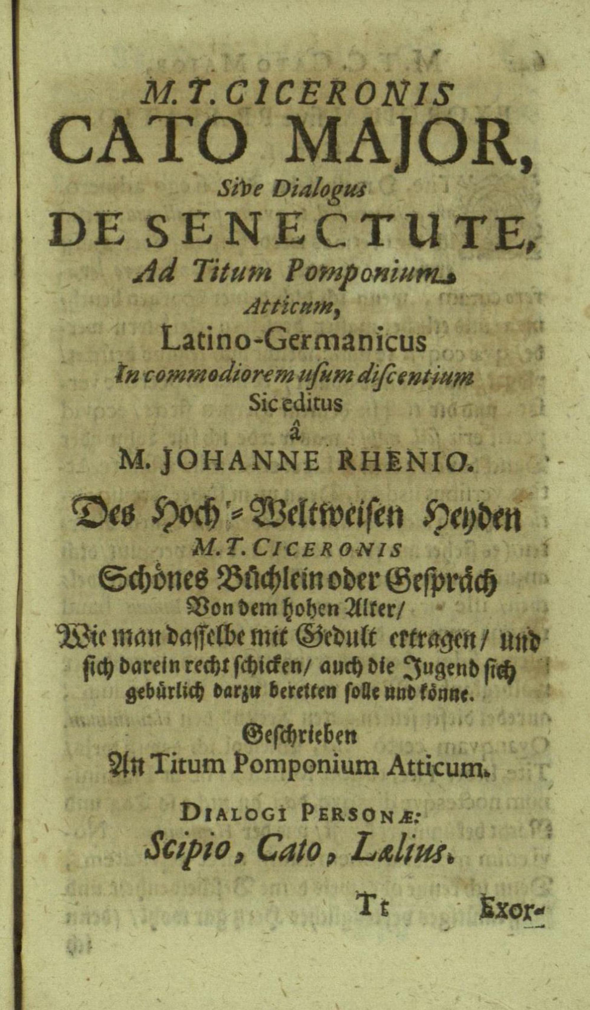 M. Tullii Ciceronis De Officiis, Id est: De vita, moribus, consiliis & actionibus hominis rectè conformandis & regendis Ad Marcum Filium : Libri Tres / Ab innumeris vulgarium editionem mendis crassissimis liberati, & in gratiam & commoditatem studiosae juventutis interpretatione germanicâ perspicuâ & fideli expositi à M. Johanne Rhenio