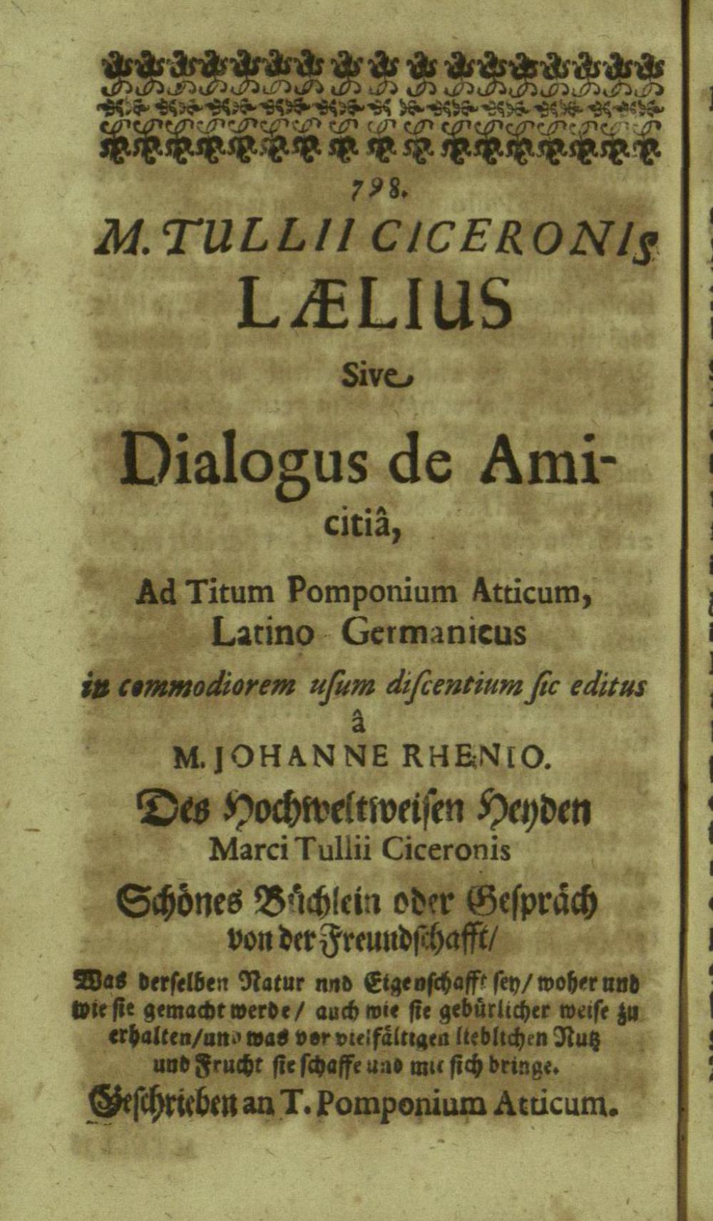 M. Tullii Ciceronis De Officiis, Id est: De vita, moribus, consiliis & actionibus hominis rectè conformandis & regendis Ad Marcum Filium : Libri Tres / Ab innumeris vulgarium editionem mendis crassissimis liberati, & in gratiam & commoditatem studiosae juventutis interpretatione germanicâ perspicuâ & fideli expositi à M. Johanne Rhenio