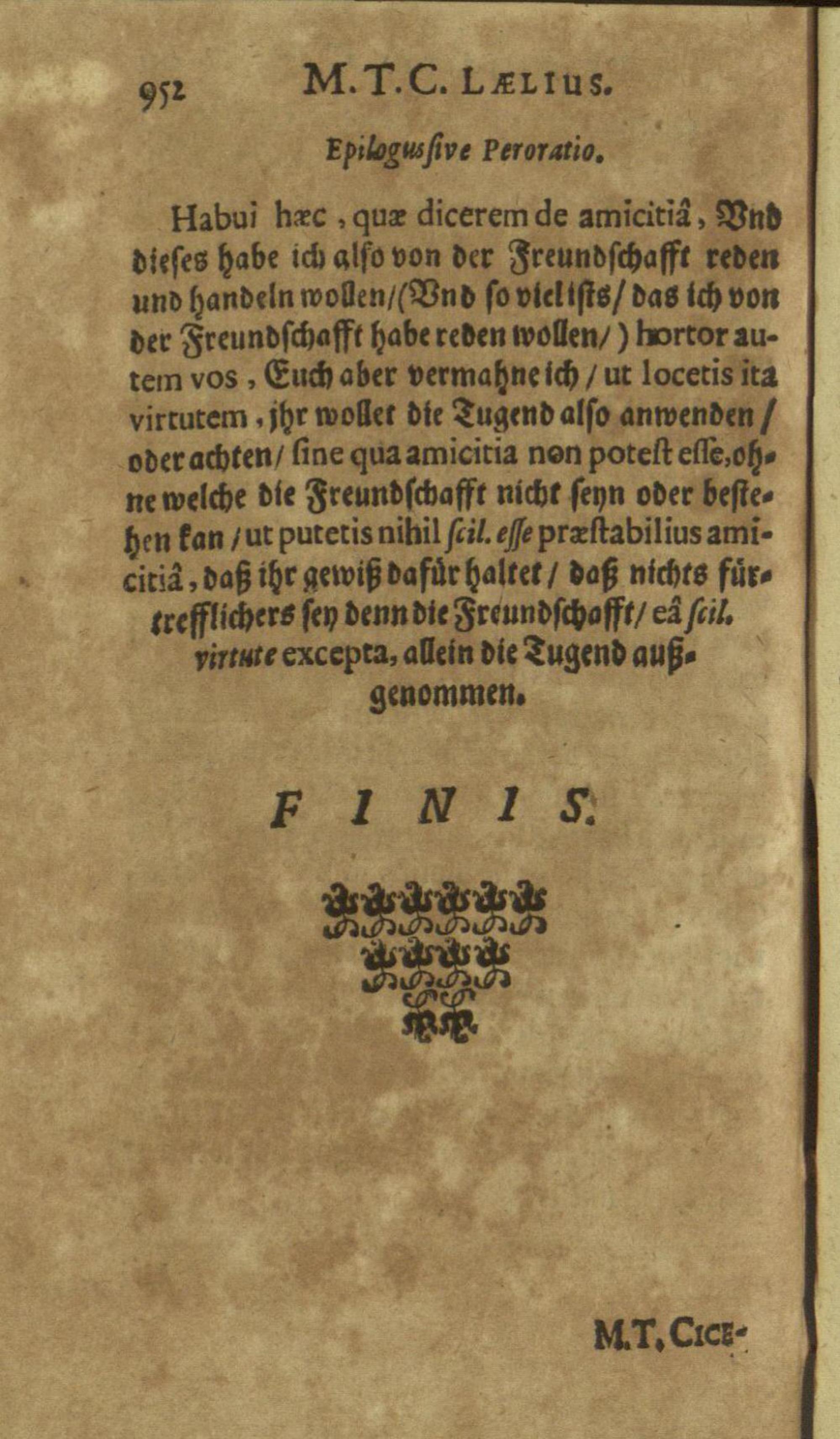 M. Tullii Ciceronis De Officiis, Id est: De vita, moribus, consiliis & actionibus hominis rectè conformandis & regendis Ad Marcum Filium : Libri Tres / Ab innumeris vulgarium editionem mendis crassissimis liberati, & in gratiam & commoditatem studiosae juventutis interpretatione germanicâ perspicuâ & fideli expositi à M. Johanne Rhenio