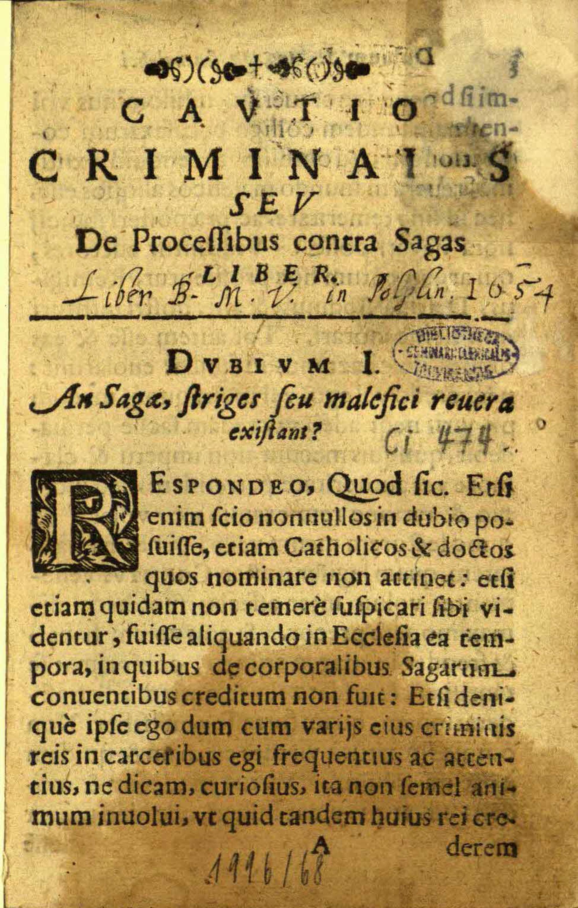 Cavtio Criminalis, Sev De Processibvs Contra Sagas Liber : Ad Magistratvs Germaniae hoc tempore necessarius, Tum autem Consiliariis, et Confessariis Principum, Inquisitoribus, Iudicibus, Aduocatis, Confessariis Reorum, Concionatoribus, caeterisque lectu vtilissimus / Avctore Incerto Theologo Romano