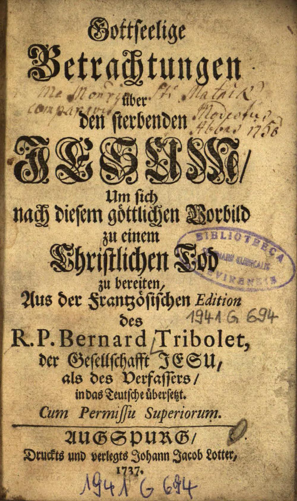 Gottseelige Betrachtungen über den sterbenden Jesum/ Um sich nach diesem göttlichen Vorbild zu einem Christlichen Tod zu bereiten / Aus der Frantzösischen Edition des R. P. Bernard Tribolet, der Gesellschafft Jesu, als des Verfassers/ in das Teutsche übersetzt