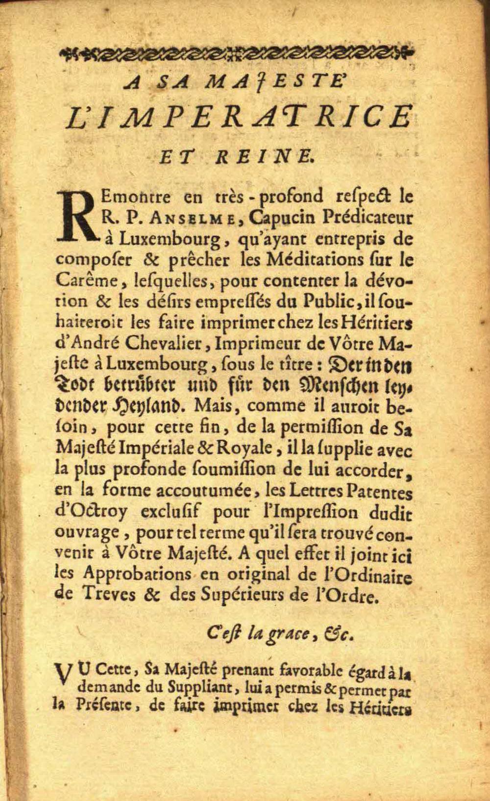 Der in den Todt betrübter, und für den Menschen Leydender Heiland, Aller Welt zum Mitleyden und zum Beyspiel vorgestellet : Das ist: Höchst-bewegliche und Lehr-volle Betrachtungen Über das Leyden Jesu Christi in drey Fasten-Gäng eingetheilet/ Und dem in aller Menge zulauffenden Volck in der Capuciner-Kirchen zu Luxemburg bey jährlicher Andacht zum Heiligen Creutz von der Cantzel vorgetragen / Von A. U. P. F. Anselmo Capuciner Prediger