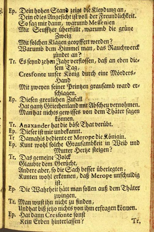 Merope Opera : Welche Zu Cremsier im Sommer des Jahrs 1727. in Wälscher Sprach gesungen/ und ins Teutsche übersetzet worden ; Auff gnädigsten Befehl, Des Hochwürdigst-Hochgebohrnen Fürsten und Herrn/ Herrn Wolffgang, Der Heil: Röm: Kirchen (Titl:) S. Marcelli Priester/ Cardinalen Von Schrattenbach, Protectorn der Teutschen Nation/ Bischoffen zu Ollmütz/ Hertzogen/ deß H. Röm: Reichs Fürsten/ und der Königl: Böheimbischen Capellen Graffen/ wie auch der Röm: Kays: und Königl: Cathol: Majest: würcklich geheimer Rath