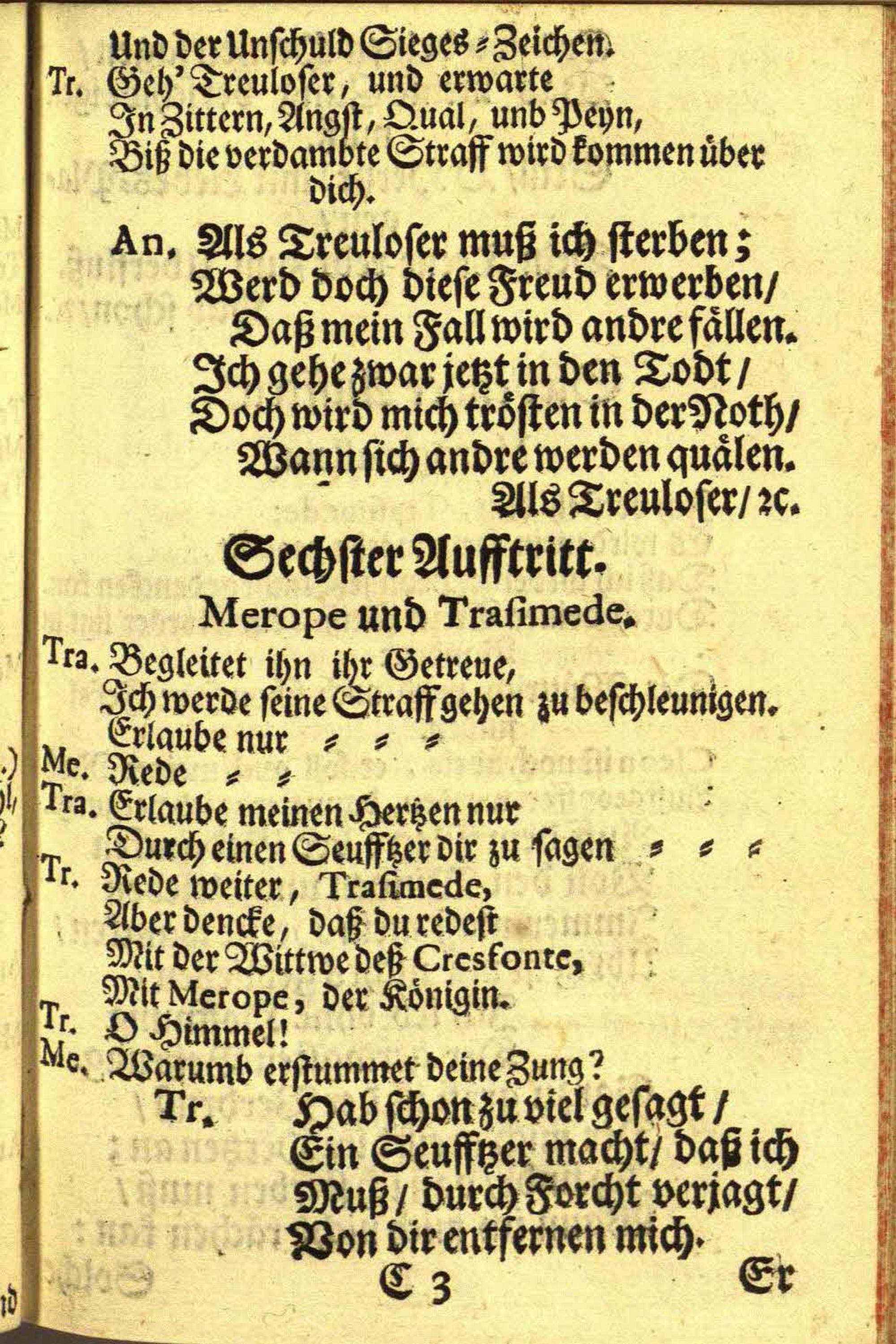 Merope Opera : Welche Zu Cremsier im Sommer des Jahrs 1727. in Wälscher Sprach gesungen/ und ins Teutsche übersetzet worden ; Auff gnädigsten Befehl, Des Hochwürdigst-Hochgebohrnen Fürsten und Herrn/ Herrn Wolffgang, Der Heil: Röm: Kirchen (Titl:) S. Marcelli Priester/ Cardinalen Von Schrattenbach, Protectorn der Teutschen Nation/ Bischoffen zu Ollmütz/ Hertzogen/ deß H. Röm: Reichs Fürsten/ und der Königl: Böheimbischen Capellen Graffen/ wie auch der Röm: Kays: und Königl: Cathol: Majest: würcklich geheimer Rath