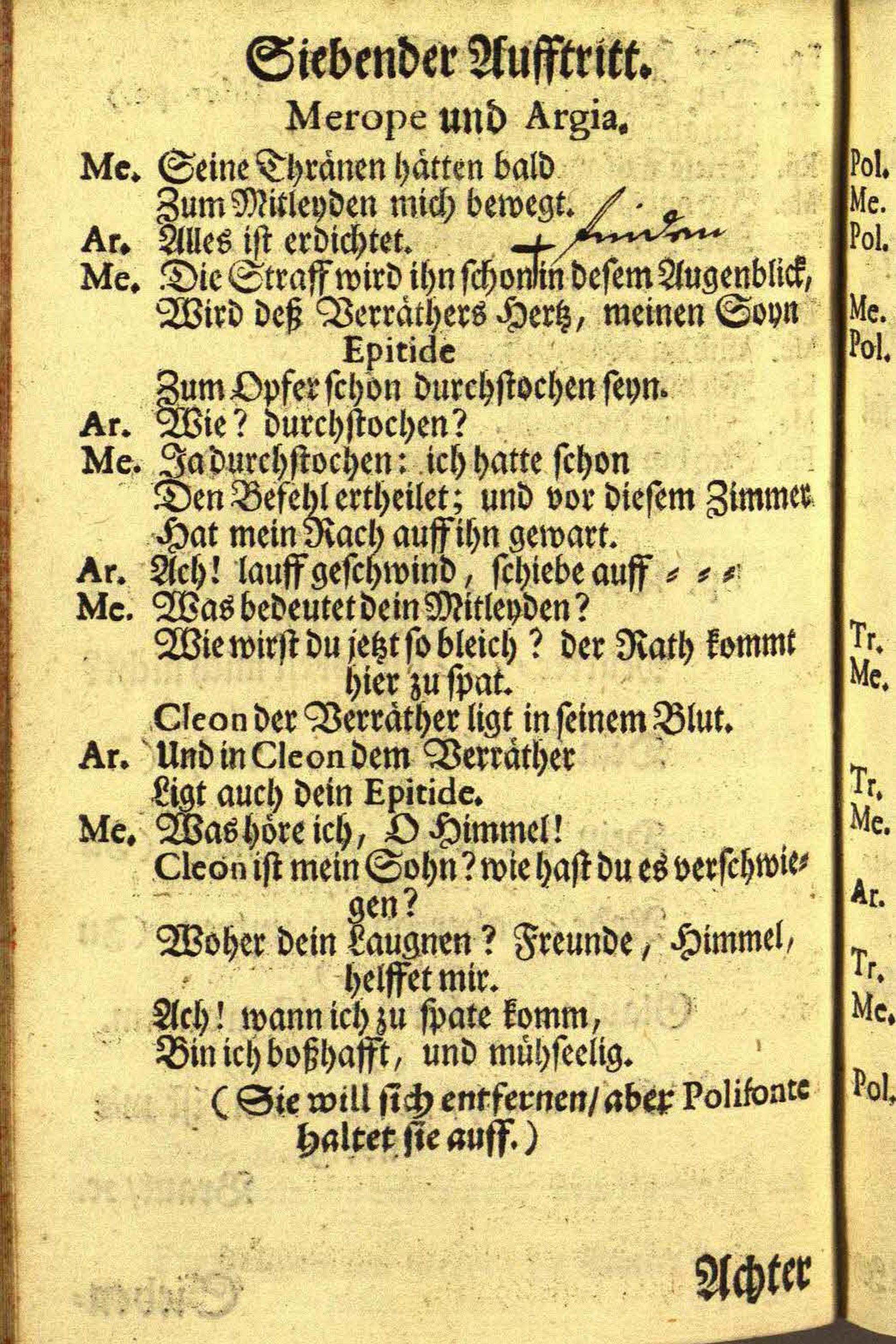 Merope Opera : Welche Zu Cremsier im Sommer des Jahrs 1727. in Wälscher Sprach gesungen/ und ins Teutsche übersetzet worden ; Auff gnädigsten Befehl, Des Hochwürdigst-Hochgebohrnen Fürsten und Herrn/ Herrn Wolffgang, Der Heil: Röm: Kirchen (Titl:) S. Marcelli Priester/ Cardinalen Von Schrattenbach, Protectorn der Teutschen Nation/ Bischoffen zu Ollmütz/ Hertzogen/ deß H. Röm: Reichs Fürsten/ und der Königl: Böheimbischen Capellen Graffen/ wie auch der Röm: Kays: und Königl: Cathol: Majest: würcklich geheimer Rath