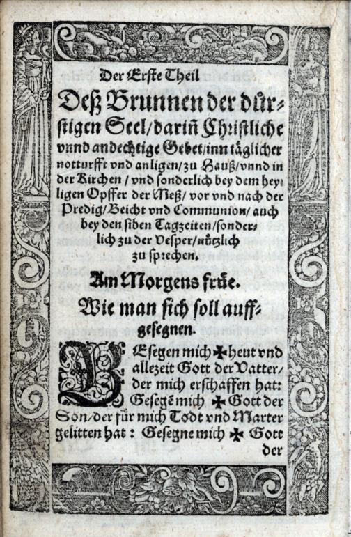 Der Geistlich|| Brun[n] der dür-||stigen Seel, die vor allen|| dingen nach Gott, vnd|| was Gottselig ist, dürstet:|| : Voll Christlicher Gebet, Betrach-||tung, Lob vnd dancksagung: sambt|| dem Marterwoch Büchel.|| / Durch D. Philip Dobereiner.||