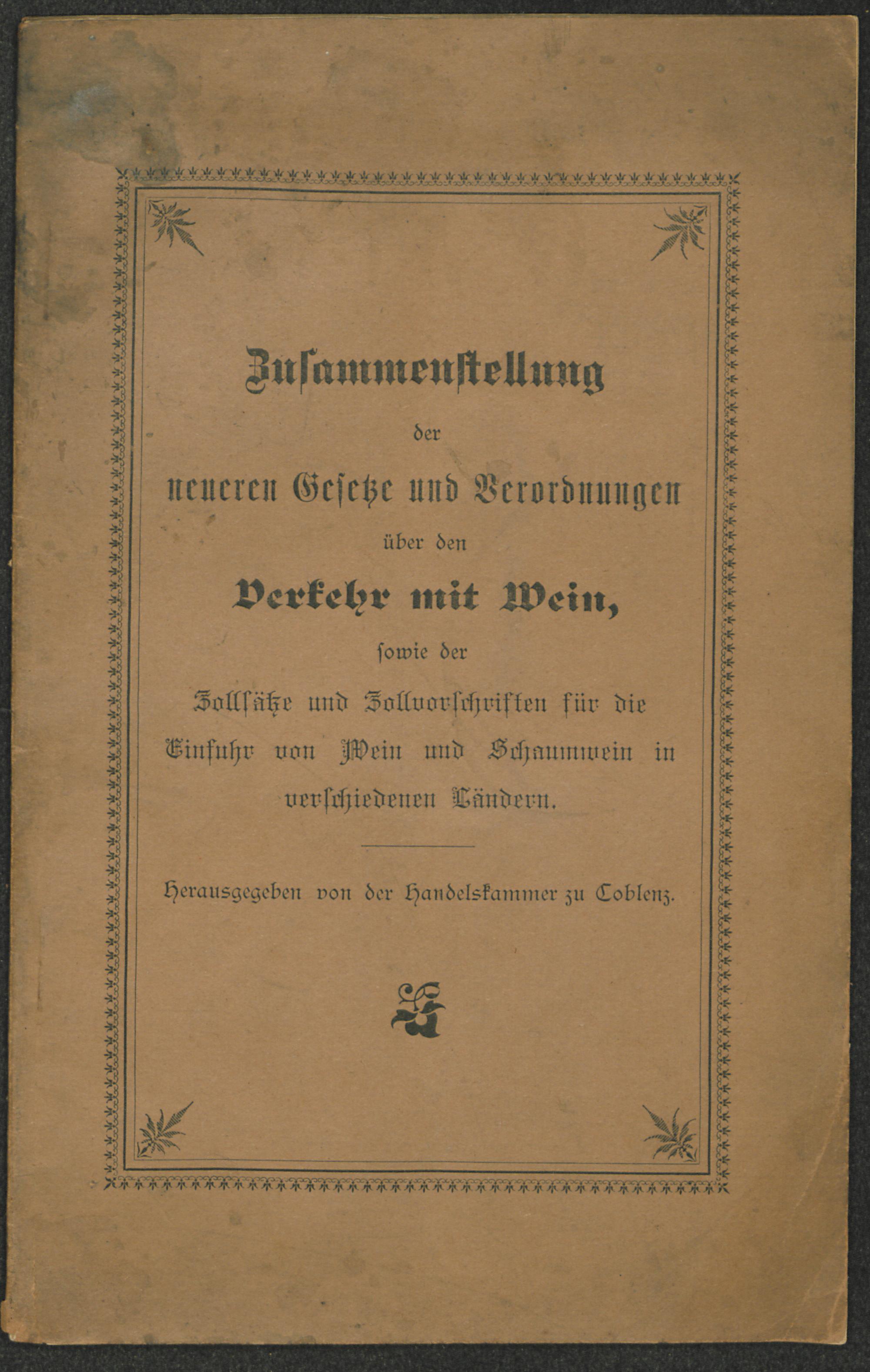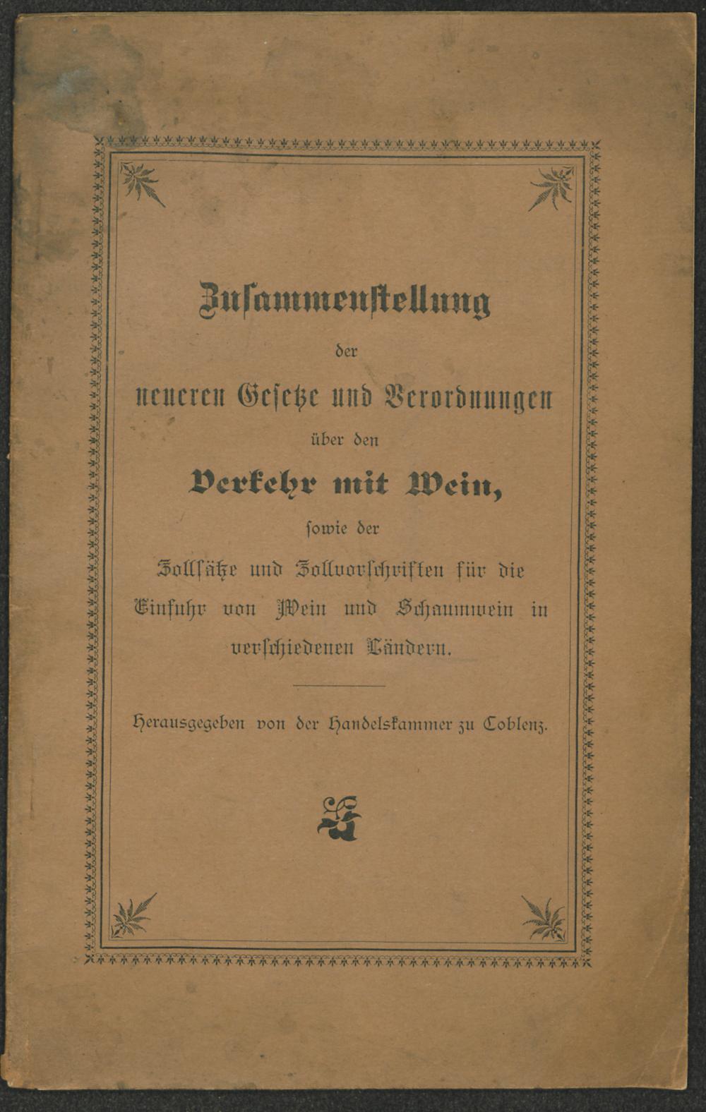 Zusammenstellung der neueren Gesetze und Verordnungen über den Verkehr mit Wein / hrsg. von der Handelskammer zu Coblenz