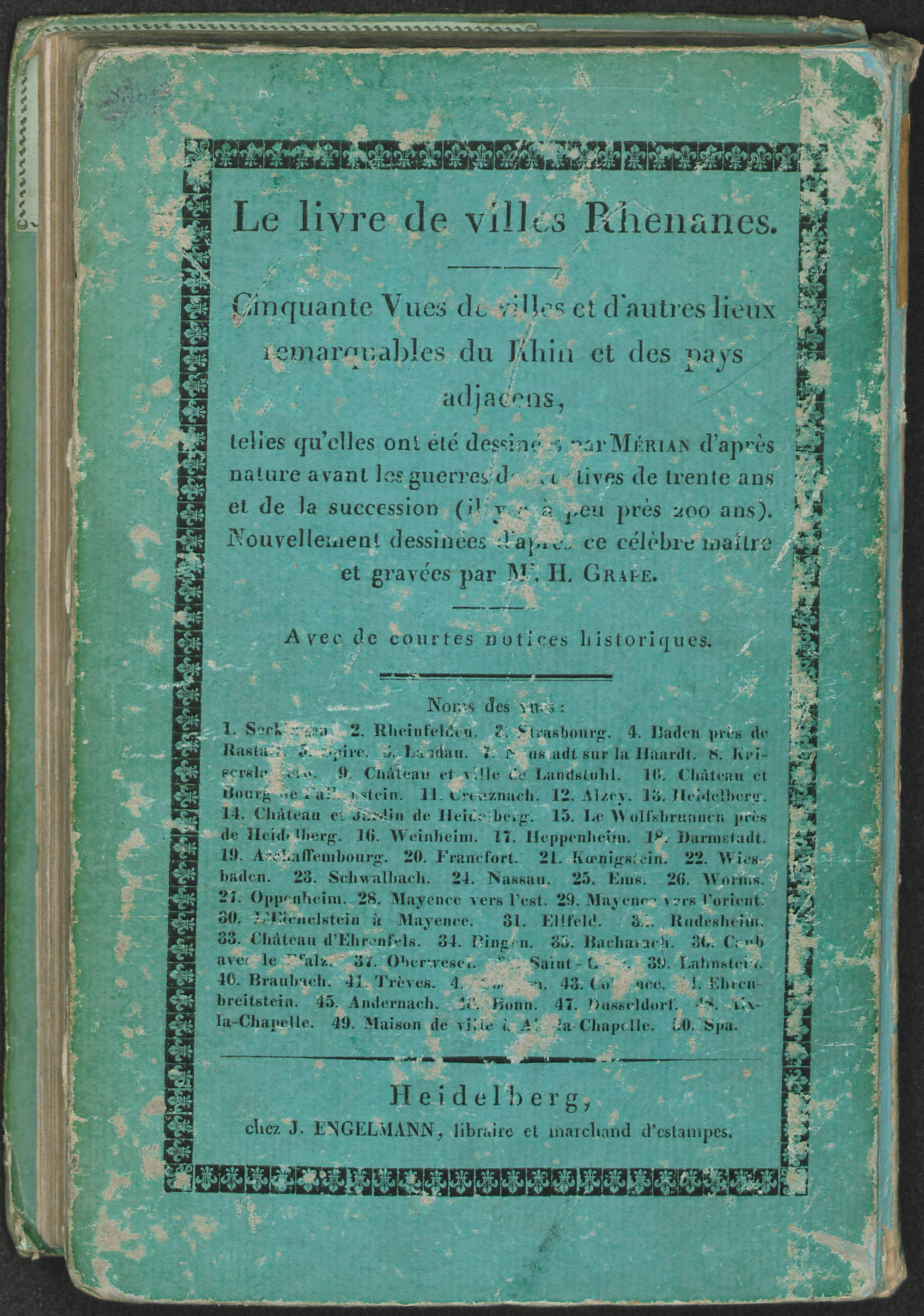 Rheinisches Städtebuch oder getreue Abbildung von fünfzig Städten und merkwürdigen Orten in den Rheinischen Landen : wie solche vor dem zerstörenden dreyßigjährigen und den folgenden Kriegen (vor etwa 200 Jahren) von Merian naturgetreu aufgenommen worden sind ; mit kurzen historischen Notizen = Le livre de villes Rhenanes / aufs neue sauber gezeichnet und gestochen von H. Grape