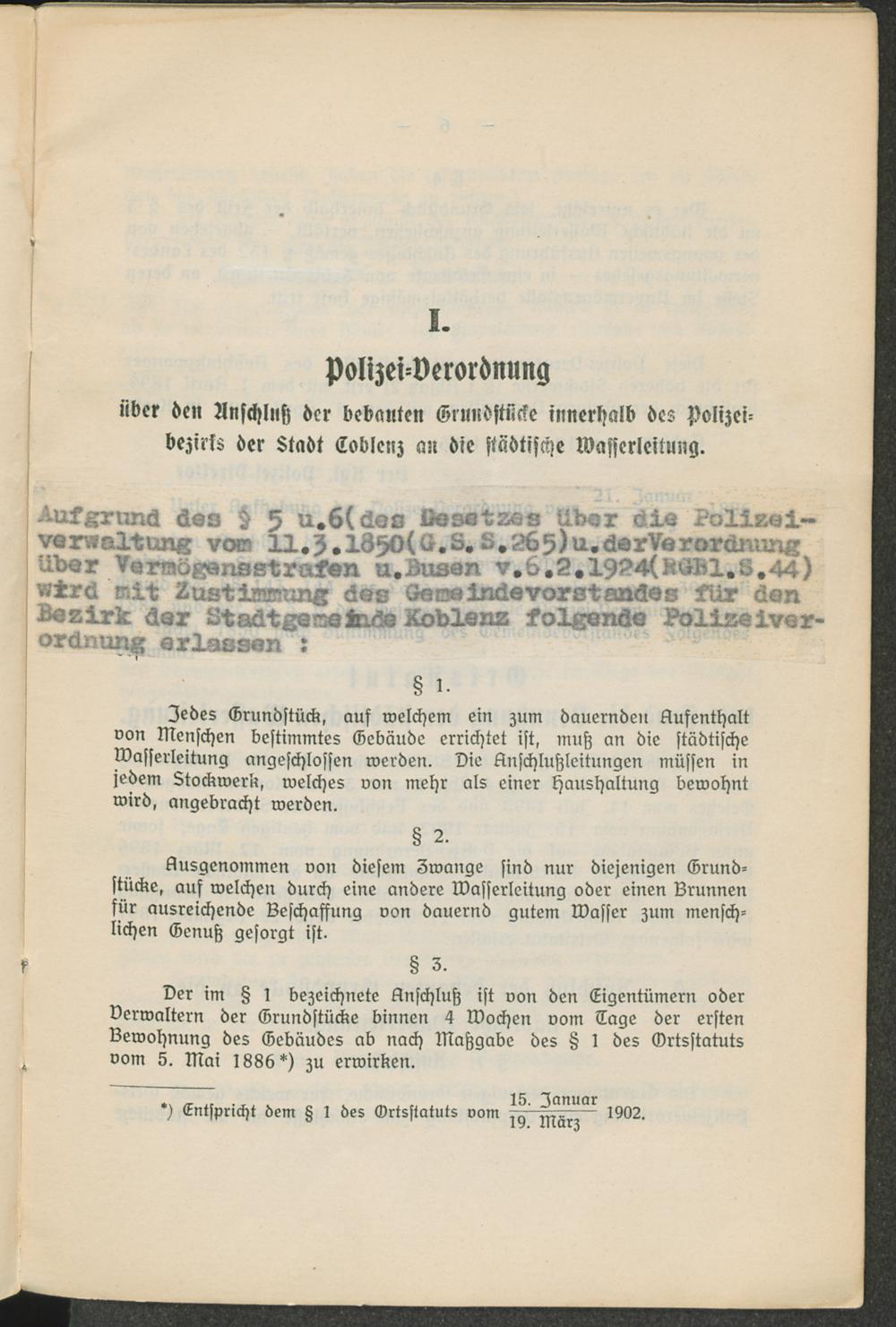 I. Polizei-Verordnung über den Anschluß der bebauten Grundstücke innerhalt des Polizeibezirks der Stadt Coblenz an die städtische Wasserleitung.