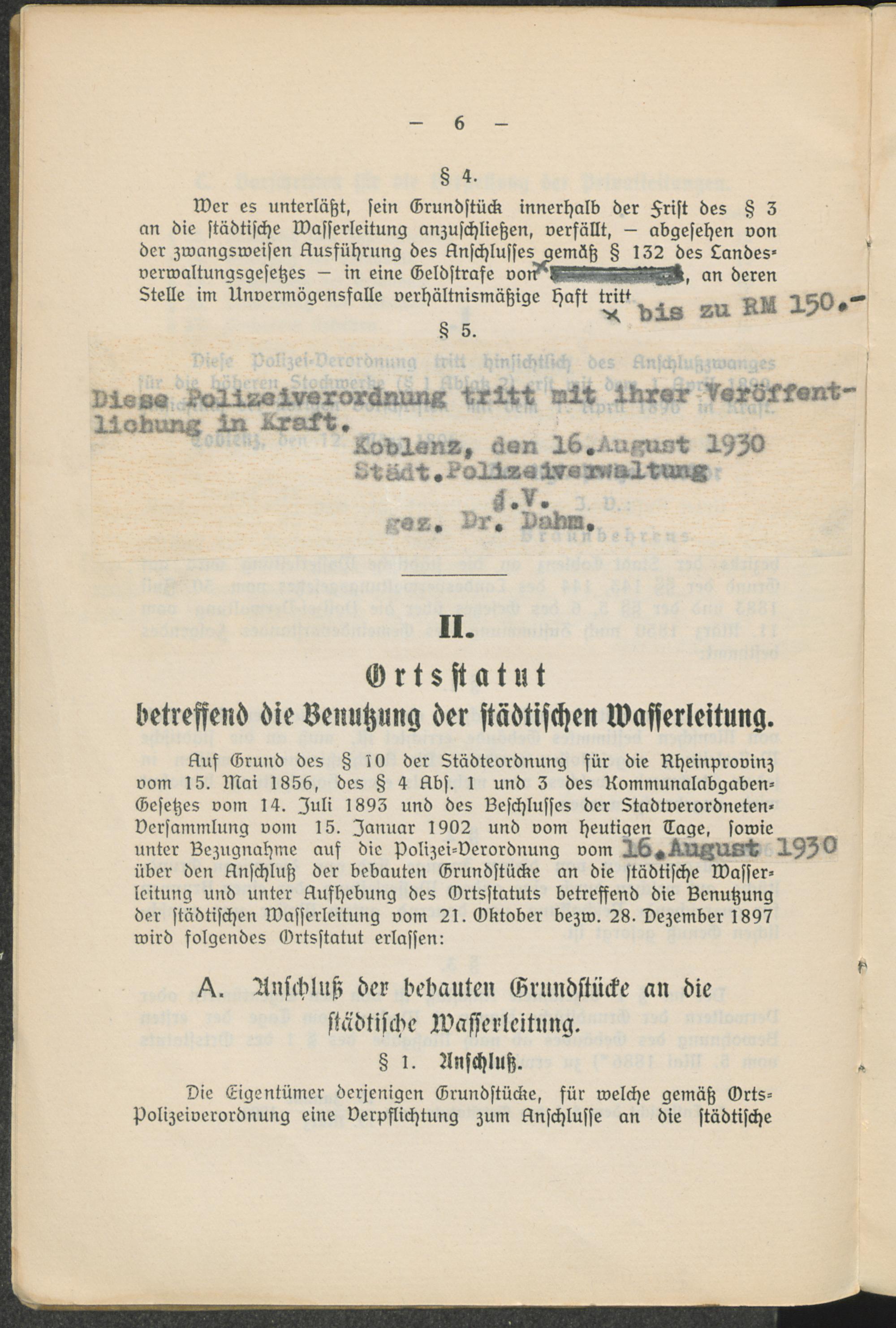 I. Polizei-Verordnung über den Anschluß der bebauten Grundstücke innerhalt des Polizeibezirks der Stadt Coblenz an die städtische Wasserleitung.