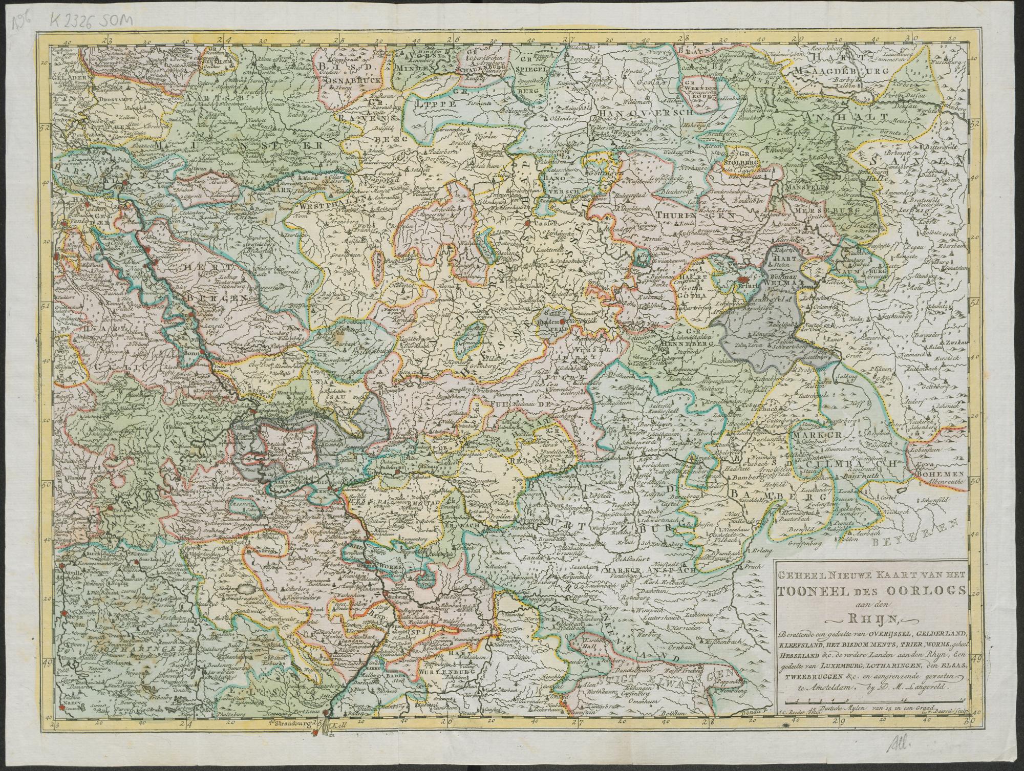 Geheel Nieuwe Kaart Van Het Tooneel Des Oorlogs aan den Rhijn : Bevattende een gedeelte van Overijssel, Gelderland, Kleefsland, Het Bisdom Ments, Trier, Worms, geheet Hesseland & c. de verdere Landen aan den Rhyn, Een gedeelte van Luxemburg, Lotharingen, den Elsas, Tweebruggen & c. en aangrenzende gewesten / by D. M. Langeveld ; C. v. Baarsel sculp.