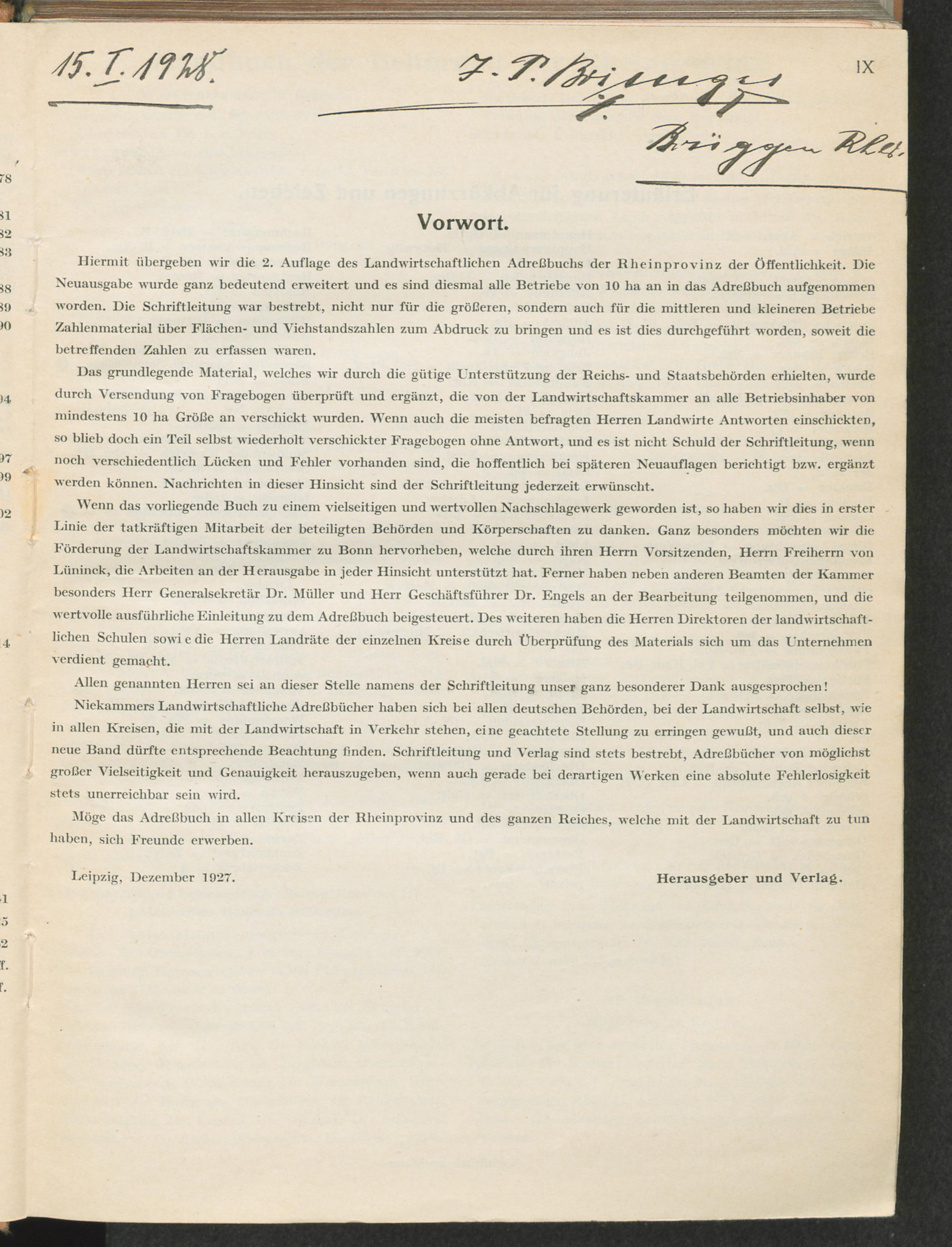 Landwirtschaftliches Adreßbuch der Rittergüter und Höfe der Rheinprovinz einschl. Landesteil Birkenfeld : Verzeichnis sämtlicher Rittergüter, Güter und Höfe von ca. 10 ha aufwärts mit Angabe der Gutseigenschaft, der Gesamtfläche und des Flächeninhalts der einzelnen Kulturen, des Viehbestandes, der eigenen industriellen Anlagen und Fernsprechanschlüsse, Angabe der Besitzer, Pächter und Verwalter, der Post-, Telegraphen- und Eisenbahnstationen und deren Entfernung vom Gute, der Land- und Amtsgerichte, einem alphabetischen Orts- und Personenregister, einem Verzeichnis der wichtigsten staatlichen Behörden und Dienststellen, der landwirtschaftlichen Vereine und Körperschaften und einer mehrfarbigen Landkarte im Maßstabe 1 : 1000000 / mit Unterstützung der landwirtschaftskammer zu Bonn a. Rh. nach amtlichen Quellen und auf Grund direkter Angaben bearb. von Ernst Seyfert und Hans Wehner ; mit einer Einleitung von Müller und Engels