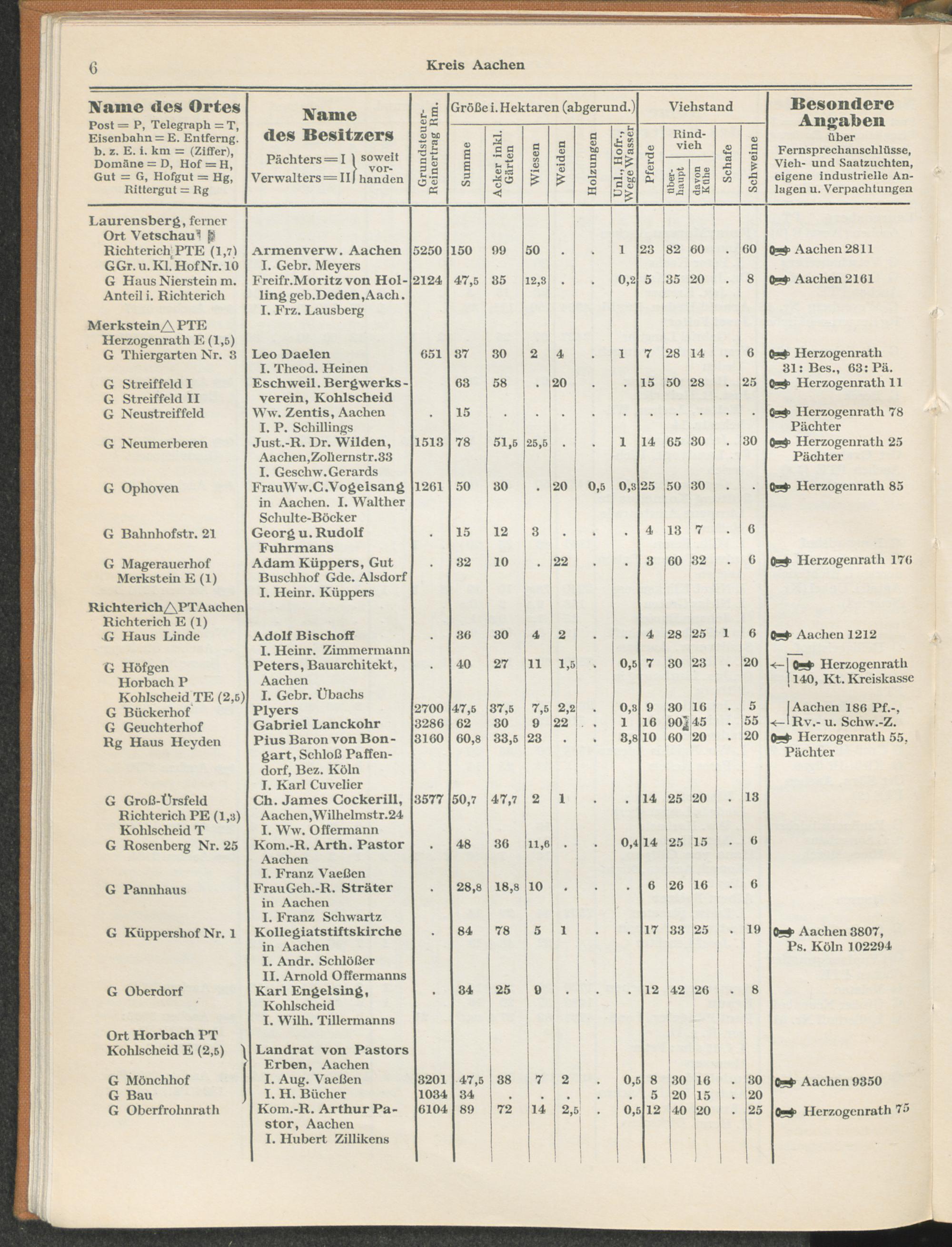 Landwirtschaftliches Adreßbuch der Rittergüter und Höfe der Rheinprovinz einschl. Landesteil Birkenfeld : Verzeichnis sämtlicher Rittergüter, Güter und Höfe von ca. 10 ha aufwärts mit Angabe der Gutseigenschaft, der Gesamtfläche und des Flächeninhalts der einzelnen Kulturen, des Viehbestandes, der eigenen industriellen Anlagen und Fernsprechanschlüsse, Angabe der Besitzer, Pächter und Verwalter, der Post-, Telegraphen- und Eisenbahnstationen und deren Entfernung vom Gute, der Land- und Amtsgerichte, einem alphabetischen Orts- und Personenregister, einem Verzeichnis der wichtigsten staatlichen Behörden und Dienststellen, der landwirtschaftlichen Vereine und Körperschaften und einer mehrfarbigen Landkarte im Maßstabe 1 : 1000000 / mit Unterstützung der landwirtschaftskammer zu Bonn a. Rh. nach amtlichen Quellen und auf Grund direkter Angaben bearb. von Ernst Seyfert und Hans Wehner ; mit einer Einleitung von Müller und Engels