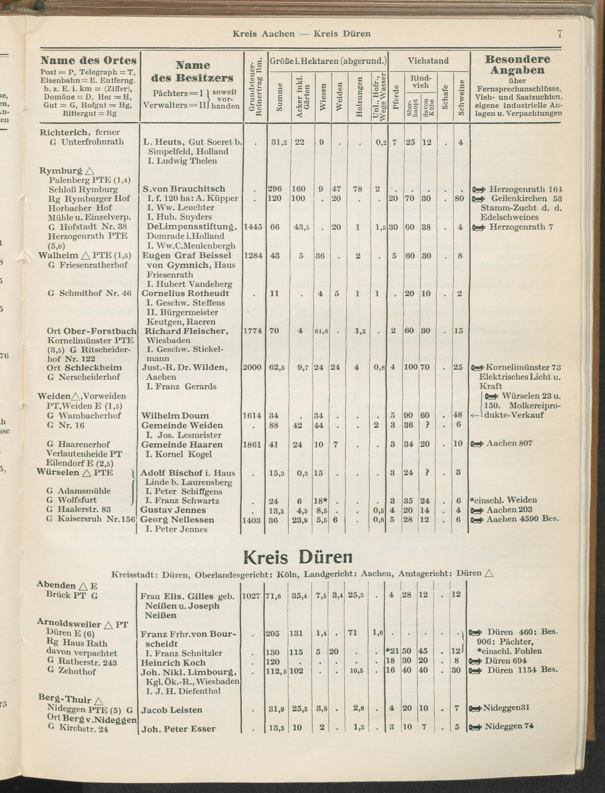 Landwirtschaftliches Adreßbuch der Rittergüter und Höfe der Rheinprovinz einschl. Landesteil Birkenfeld : Verzeichnis sämtlicher Rittergüter, Güter und Höfe von ca. 10 ha aufwärts mit Angabe der Gutseigenschaft, der Gesamtfläche und des Flächeninhalts der einzelnen Kulturen, des Viehbestandes, der eigenen industriellen Anlagen und Fernsprechanschlüsse, Angabe der Besitzer, Pächter und Verwalter, der Post-, Telegraphen- und Eisenbahnstationen und deren Entfernung vom Gute, der Land- und Amtsgerichte, einem alphabetischen Orts- und Personenregister, einem Verzeichnis der wichtigsten staatlichen Behörden und Dienststellen, der landwirtschaftlichen Vereine und Körperschaften und einer mehrfarbigen Landkarte im Maßstabe 1 : 1000000 / mit Unterstützung der landwirtschaftskammer zu Bonn a. Rh. nach amtlichen Quellen und auf Grund direkter Angaben bearb. von Ernst Seyfert und Hans Wehner ; mit einer Einleitung von Müller und Engels