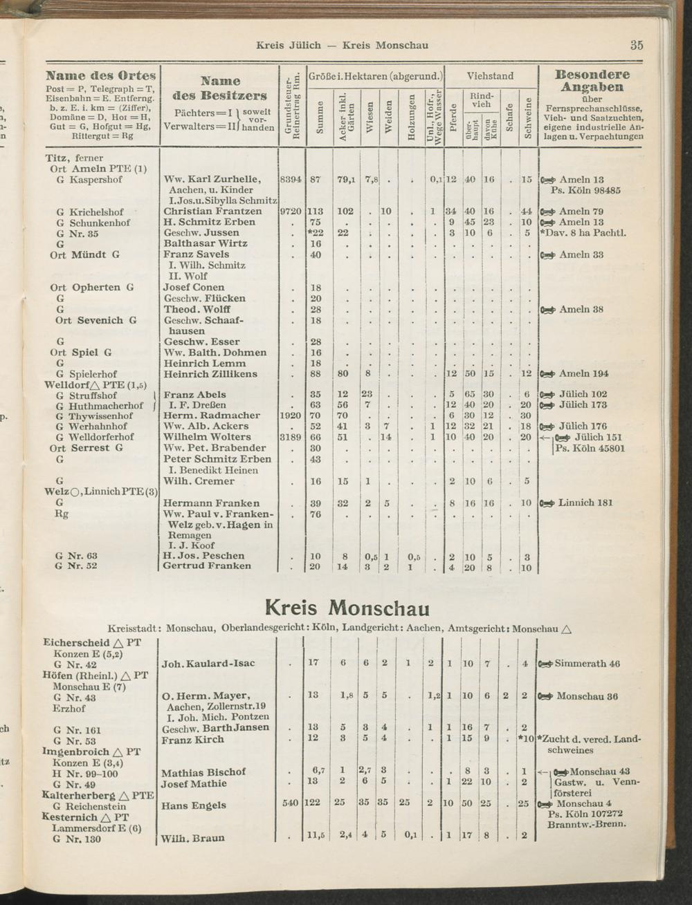 Landwirtschaftliches Adreßbuch der Rittergüter und Höfe der Rheinprovinz einschl. Landesteil Birkenfeld : Verzeichnis sämtlicher Rittergüter, Güter und Höfe von ca. 10 ha aufwärts mit Angabe der Gutseigenschaft, der Gesamtfläche und des Flächeninhalts der einzelnen Kulturen, des Viehbestandes, der eigenen industriellen Anlagen und Fernsprechanschlüsse, Angabe der Besitzer, Pächter und Verwalter, der Post-, Telegraphen- und Eisenbahnstationen und deren Entfernung vom Gute, der Land- und Amtsgerichte, einem alphabetischen Orts- und Personenregister, einem Verzeichnis der wichtigsten staatlichen Behörden und Dienststellen, der landwirtschaftlichen Vereine und Körperschaften und einer mehrfarbigen Landkarte im Maßstabe 1 : 1000000 / mit Unterstützung der landwirtschaftskammer zu Bonn a. Rh. nach amtlichen Quellen und auf Grund direkter Angaben bearb. von Ernst Seyfert und Hans Wehner ; mit einer Einleitung von Müller und Engels