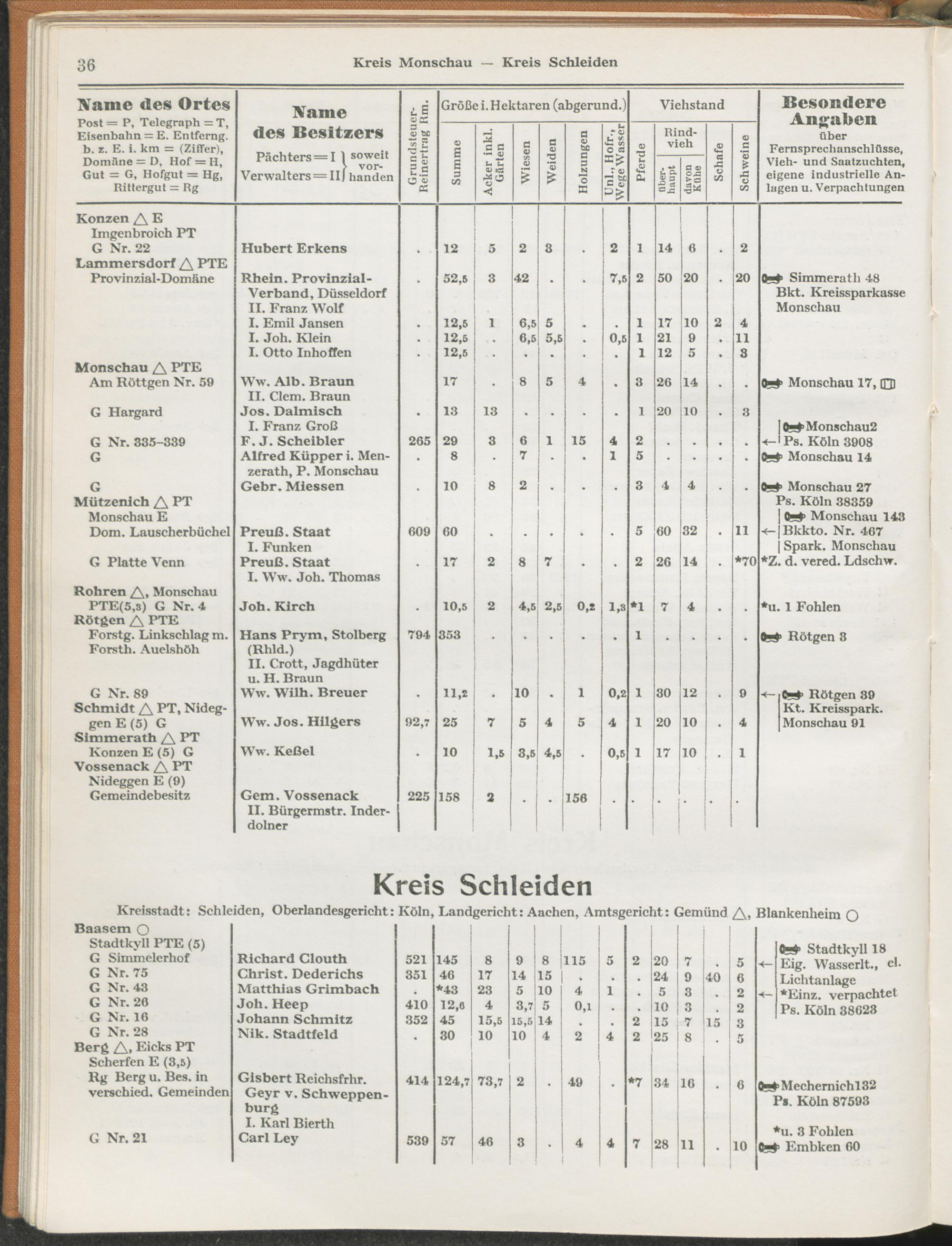 Landwirtschaftliches Adreßbuch der Rittergüter und Höfe der Rheinprovinz einschl. Landesteil Birkenfeld : Verzeichnis sämtlicher Rittergüter, Güter und Höfe von ca. 10 ha aufwärts mit Angabe der Gutseigenschaft, der Gesamtfläche und des Flächeninhalts der einzelnen Kulturen, des Viehbestandes, der eigenen industriellen Anlagen und Fernsprechanschlüsse, Angabe der Besitzer, Pächter und Verwalter, der Post-, Telegraphen- und Eisenbahnstationen und deren Entfernung vom Gute, der Land- und Amtsgerichte, einem alphabetischen Orts- und Personenregister, einem Verzeichnis der wichtigsten staatlichen Behörden und Dienststellen, der landwirtschaftlichen Vereine und Körperschaften und einer mehrfarbigen Landkarte im Maßstabe 1 : 1000000 / mit Unterstützung der landwirtschaftskammer zu Bonn a. Rh. nach amtlichen Quellen und auf Grund direkter Angaben bearb. von Ernst Seyfert und Hans Wehner ; mit einer Einleitung von Müller und Engels