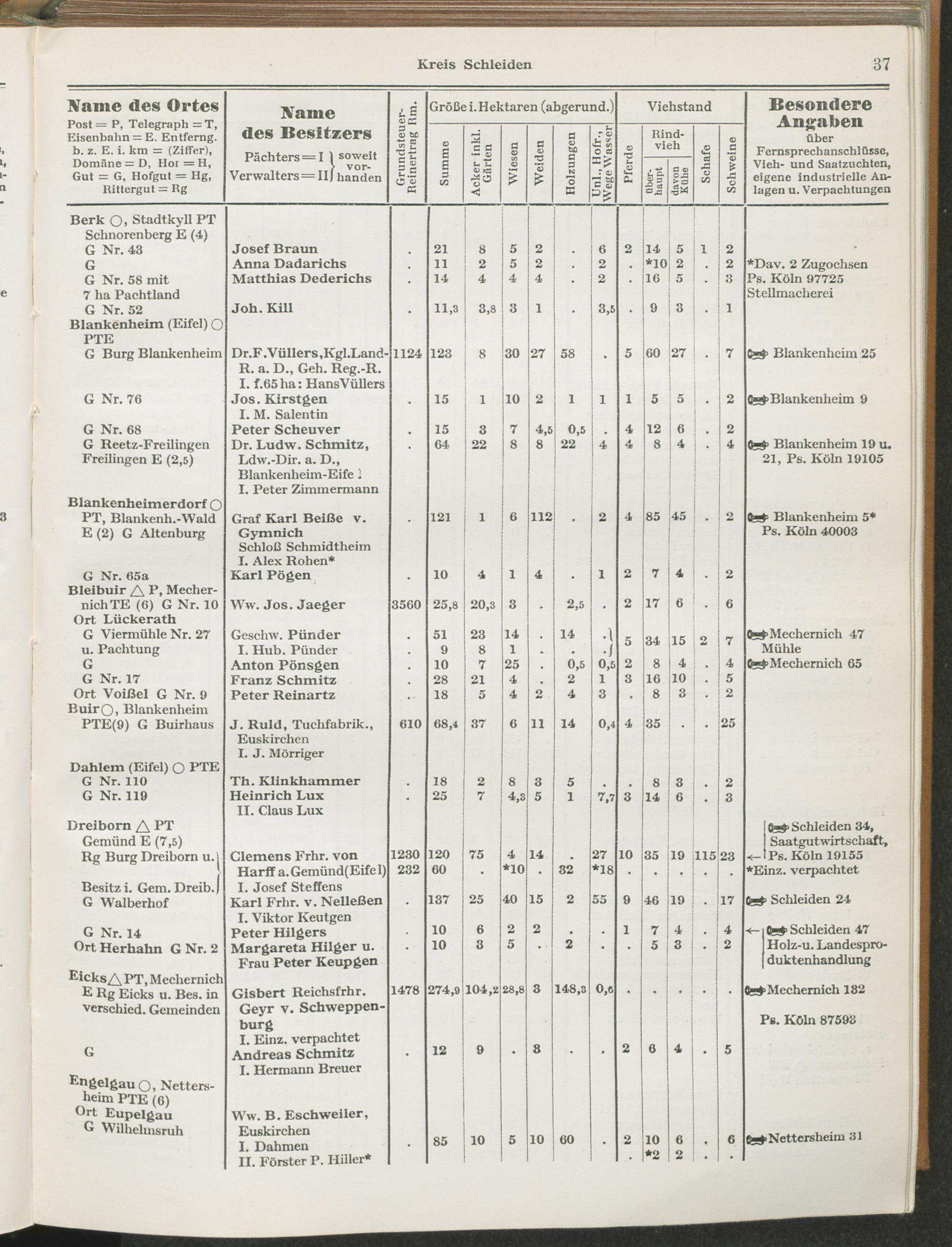 Landwirtschaftliches Adreßbuch der Rittergüter und Höfe der Rheinprovinz einschl. Landesteil Birkenfeld : Verzeichnis sämtlicher Rittergüter, Güter und Höfe von ca. 10 ha aufwärts mit Angabe der Gutseigenschaft, der Gesamtfläche und des Flächeninhalts der einzelnen Kulturen, des Viehbestandes, der eigenen industriellen Anlagen und Fernsprechanschlüsse, Angabe der Besitzer, Pächter und Verwalter, der Post-, Telegraphen- und Eisenbahnstationen und deren Entfernung vom Gute, der Land- und Amtsgerichte, einem alphabetischen Orts- und Personenregister, einem Verzeichnis der wichtigsten staatlichen Behörden und Dienststellen, der landwirtschaftlichen Vereine und Körperschaften und einer mehrfarbigen Landkarte im Maßstabe 1 : 1000000 / mit Unterstützung der landwirtschaftskammer zu Bonn a. Rh. nach amtlichen Quellen und auf Grund direkter Angaben bearb. von Ernst Seyfert und Hans Wehner ; mit einer Einleitung von Müller und Engels