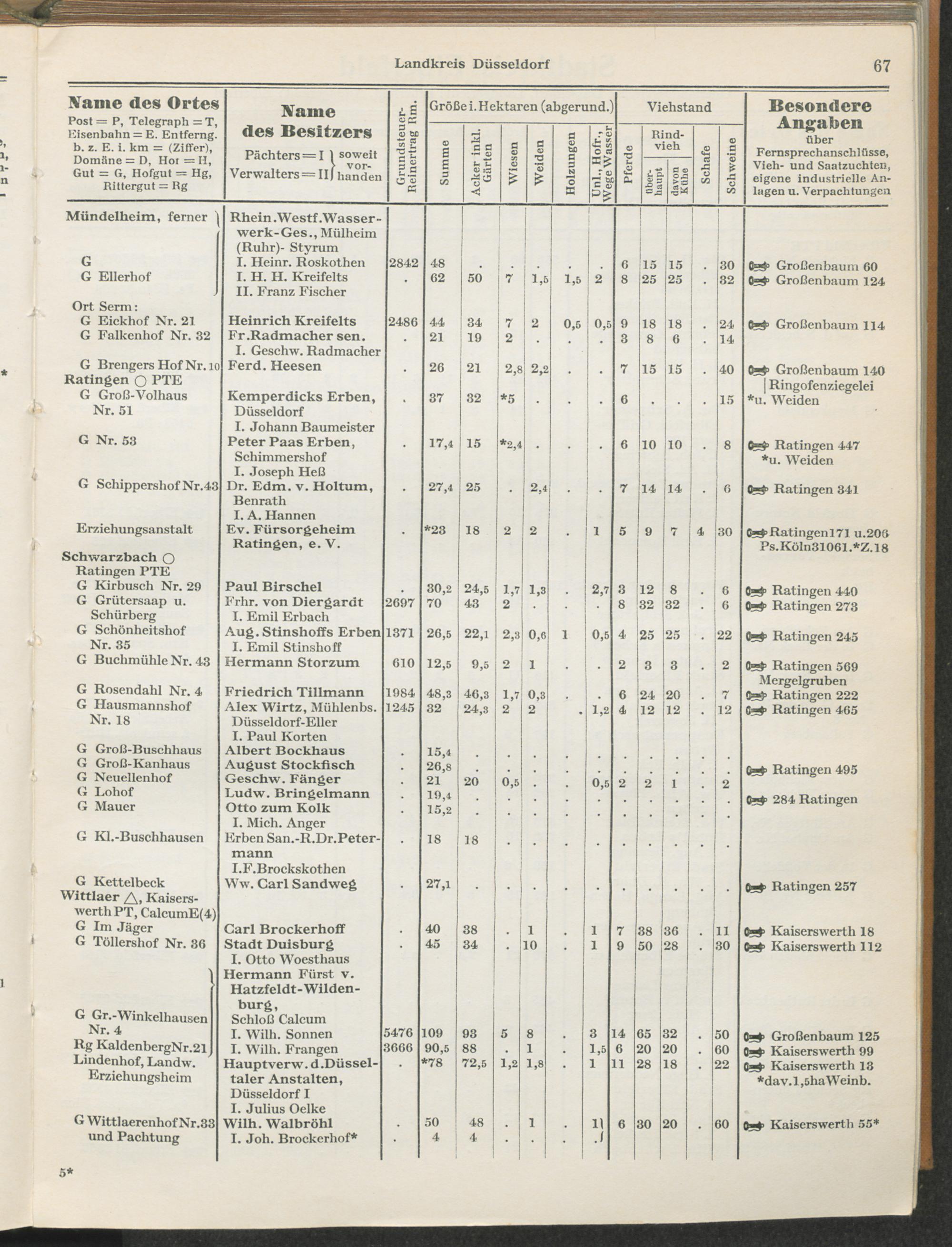 Landwirtschaftliches Adreßbuch der Rittergüter und Höfe der Rheinprovinz einschl. Landesteil Birkenfeld : Verzeichnis sämtlicher Rittergüter, Güter und Höfe von ca. 10 ha aufwärts mit Angabe der Gutseigenschaft, der Gesamtfläche und des Flächeninhalts der einzelnen Kulturen, des Viehbestandes, der eigenen industriellen Anlagen und Fernsprechanschlüsse, Angabe der Besitzer, Pächter und Verwalter, der Post-, Telegraphen- und Eisenbahnstationen und deren Entfernung vom Gute, der Land- und Amtsgerichte, einem alphabetischen Orts- und Personenregister, einem Verzeichnis der wichtigsten staatlichen Behörden und Dienststellen, der landwirtschaftlichen Vereine und Körperschaften und einer mehrfarbigen Landkarte im Maßstabe 1 : 1000000 / mit Unterstützung der landwirtschaftskammer zu Bonn a. Rh. nach amtlichen Quellen und auf Grund direkter Angaben bearb. von Ernst Seyfert und Hans Wehner ; mit einer Einleitung von Müller und Engels