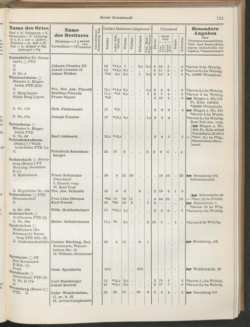 Landwirtschaftliches Adreßbuch der Rittergüter und Höfe der Rheinprovinz einschl. Landesteil Birkenfeld : Verzeichnis sämtlicher Rittergüter, Güter und Höfe von ca. 10 ha aufwärts mit Angabe der Gutseigenschaft, der Gesamtfläche und des Flächeninhalts der einzelnen Kulturen, des Viehbestandes, der eigenen industriellen Anlagen und Fernsprechanschlüsse, Angabe der Besitzer, Pächter und Verwalter, der Post-, Telegraphen- und Eisenbahnstationen und deren Entfernung vom Gute, der Land- und Amtsgerichte, einem alphabetischen Orts- und Personenregister, einem Verzeichnis der wichtigsten staatlichen Behörden und Dienststellen, der landwirtschaftlichen Vereine und Körperschaften und einer mehrfarbigen Landkarte im Maßstabe 1 : 1000000 / mit Unterstützung der landwirtschaftskammer zu Bonn a. Rh. nach amtlichen Quellen und auf Grund direkter Angaben bearb. von Ernst Seyfert und Hans Wehner ; mit einer Einleitung von Müller und Engels