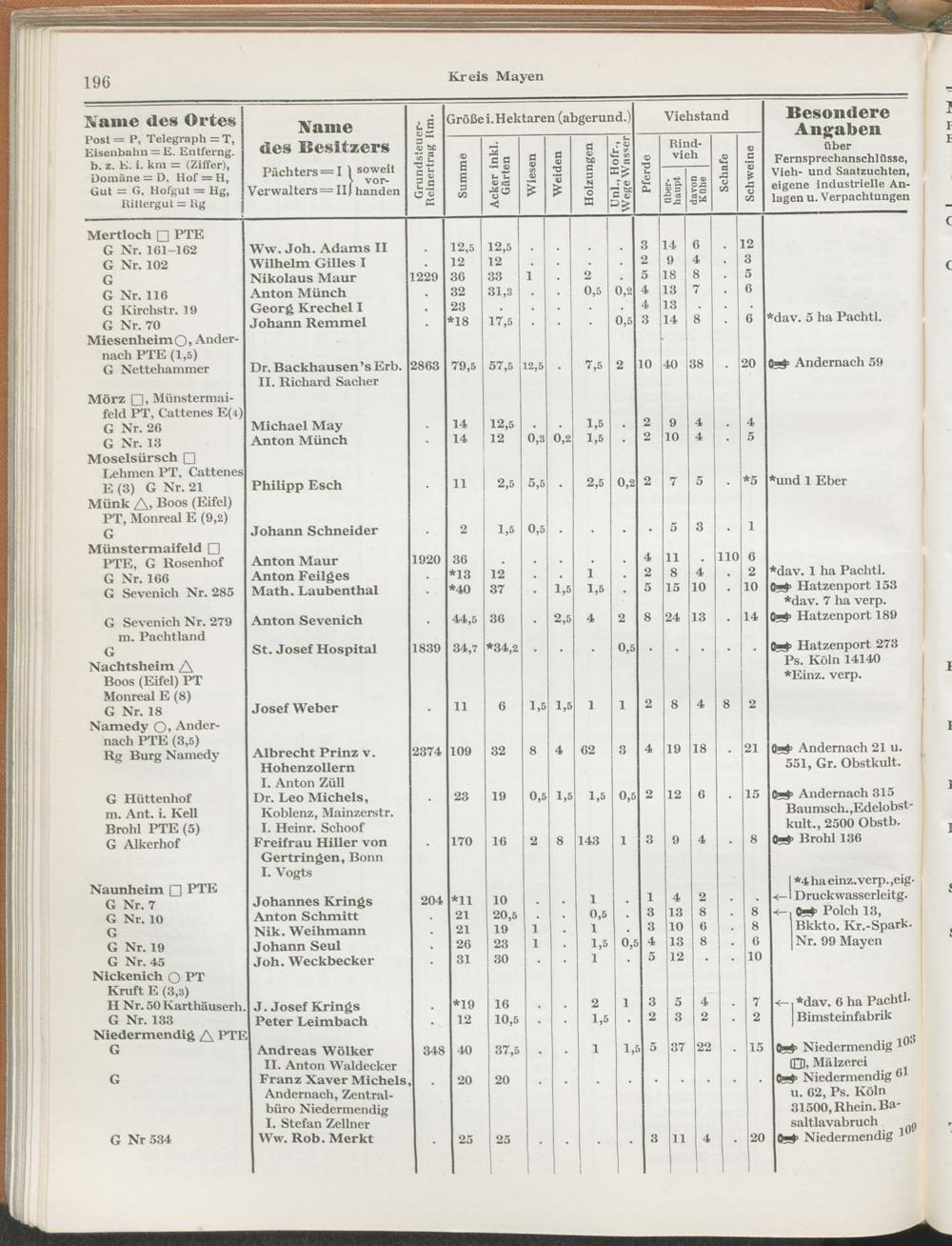 Landwirtschaftliches Adreßbuch der Rittergüter und Höfe der Rheinprovinz einschl. Landesteil Birkenfeld : Verzeichnis sämtlicher Rittergüter, Güter und Höfe von ca. 10 ha aufwärts mit Angabe der Gutseigenschaft, der Gesamtfläche und des Flächeninhalts der einzelnen Kulturen, des Viehbestandes, der eigenen industriellen Anlagen und Fernsprechanschlüsse, Angabe der Besitzer, Pächter und Verwalter, der Post-, Telegraphen- und Eisenbahnstationen und deren Entfernung vom Gute, der Land- und Amtsgerichte, einem alphabetischen Orts- und Personenregister, einem Verzeichnis der wichtigsten staatlichen Behörden und Dienststellen, der landwirtschaftlichen Vereine und Körperschaften und einer mehrfarbigen Landkarte im Maßstabe 1 : 1000000 / mit Unterstützung der landwirtschaftskammer zu Bonn a. Rh. nach amtlichen Quellen und auf Grund direkter Angaben bearb. von Ernst Seyfert und Hans Wehner ; mit einer Einleitung von Müller und Engels