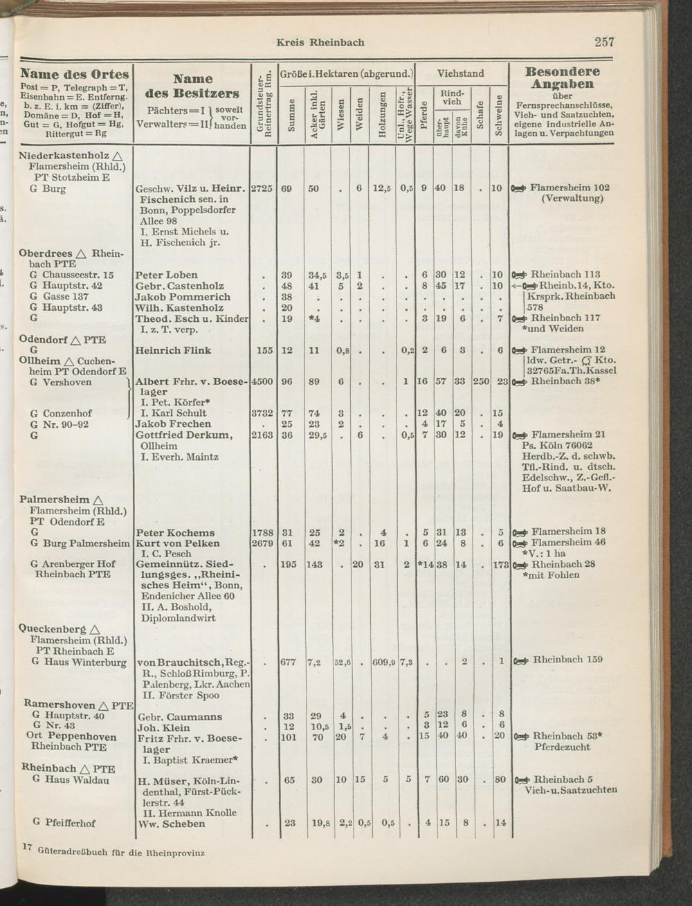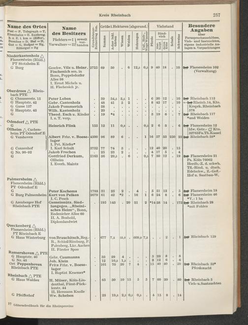 Landwirtschaftliches Adreßbuch der Rittergüter und Höfe der Rheinprovinz einschl. Landesteil Birkenfeld : Verzeichnis sämtlicher Rittergüter, Güter und Höfe von ca. 10 ha aufwärts mit Angabe der Gutseigenschaft, der Gesamtfläche und des Flächeninhalts der einzelnen Kulturen, des Viehbestandes, der eigenen industriellen Anlagen und Fernsprechanschlüsse, Angabe der Besitzer, Pächter und Verwalter, der Post-, Telegraphen- und Eisenbahnstationen und deren Entfernung vom Gute, der Land- und Amtsgerichte, einem alphabetischen Orts- und Personenregister, einem Verzeichnis der wichtigsten staatlichen Behörden und Dienststellen, der landwirtschaftlichen Vereine und Körperschaften und einer mehrfarbigen Landkarte im Maßstabe 1 : 1000000 / mit Unterstützung der landwirtschaftskammer zu Bonn a. Rh. nach amtlichen Quellen und auf Grund direkter Angaben bearb. von Ernst Seyfert und Hans Wehner ; mit einer Einleitung von Müller und Engels