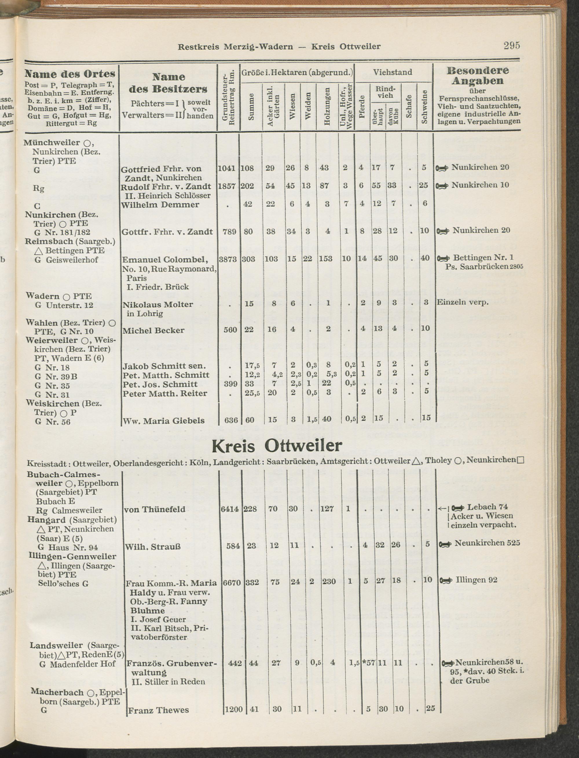 Landwirtschaftliches Adreßbuch der Rittergüter und Höfe der Rheinprovinz einschl. Landesteil Birkenfeld : Verzeichnis sämtlicher Rittergüter, Güter und Höfe von ca. 10 ha aufwärts mit Angabe der Gutseigenschaft, der Gesamtfläche und des Flächeninhalts der einzelnen Kulturen, des Viehbestandes, der eigenen industriellen Anlagen und Fernsprechanschlüsse, Angabe der Besitzer, Pächter und Verwalter, der Post-, Telegraphen- und Eisenbahnstationen und deren Entfernung vom Gute, der Land- und Amtsgerichte, einem alphabetischen Orts- und Personenregister, einem Verzeichnis der wichtigsten staatlichen Behörden und Dienststellen, der landwirtschaftlichen Vereine und Körperschaften und einer mehrfarbigen Landkarte im Maßstabe 1 : 1000000 / mit Unterstützung der landwirtschaftskammer zu Bonn a. Rh. nach amtlichen Quellen und auf Grund direkter Angaben bearb. von Ernst Seyfert und Hans Wehner ; mit einer Einleitung von Müller und Engels