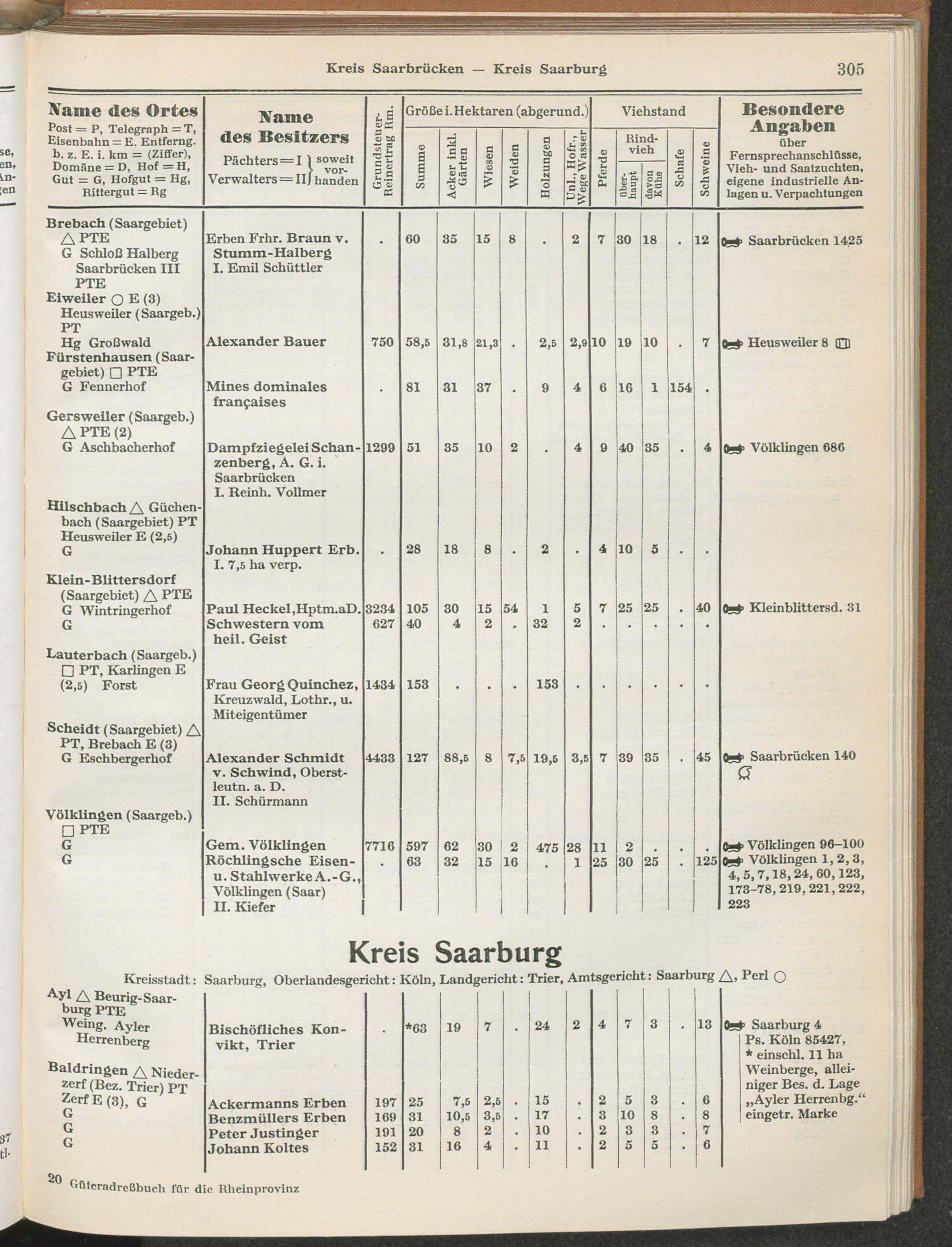 Landwirtschaftliches Adreßbuch der Rittergüter und Höfe der Rheinprovinz einschl. Landesteil Birkenfeld : Verzeichnis sämtlicher Rittergüter, Güter und Höfe von ca. 10 ha aufwärts mit Angabe der Gutseigenschaft, der Gesamtfläche und des Flächeninhalts der einzelnen Kulturen, des Viehbestandes, der eigenen industriellen Anlagen und Fernsprechanschlüsse, Angabe der Besitzer, Pächter und Verwalter, der Post-, Telegraphen- und Eisenbahnstationen und deren Entfernung vom Gute, der Land- und Amtsgerichte, einem alphabetischen Orts- und Personenregister, einem Verzeichnis der wichtigsten staatlichen Behörden und Dienststellen, der landwirtschaftlichen Vereine und Körperschaften und einer mehrfarbigen Landkarte im Maßstabe 1 : 1000000 / mit Unterstützung der landwirtschaftskammer zu Bonn a. Rh. nach amtlichen Quellen und auf Grund direkter Angaben bearb. von Ernst Seyfert und Hans Wehner ; mit einer Einleitung von Müller und Engels