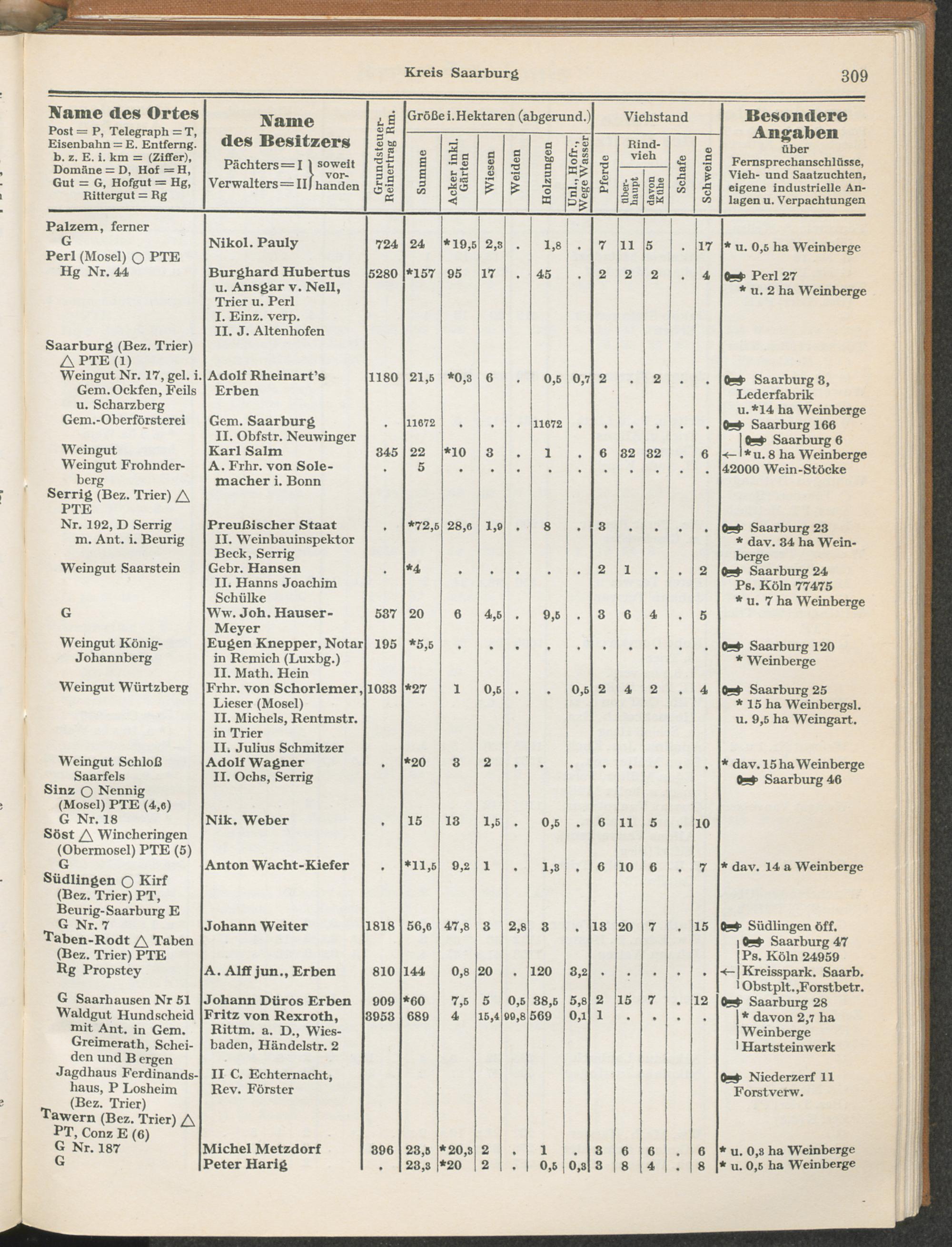 Landwirtschaftliches Adreßbuch der Rittergüter und Höfe der Rheinprovinz einschl. Landesteil Birkenfeld : Verzeichnis sämtlicher Rittergüter, Güter und Höfe von ca. 10 ha aufwärts mit Angabe der Gutseigenschaft, der Gesamtfläche und des Flächeninhalts der einzelnen Kulturen, des Viehbestandes, der eigenen industriellen Anlagen und Fernsprechanschlüsse, Angabe der Besitzer, Pächter und Verwalter, der Post-, Telegraphen- und Eisenbahnstationen und deren Entfernung vom Gute, der Land- und Amtsgerichte, einem alphabetischen Orts- und Personenregister, einem Verzeichnis der wichtigsten staatlichen Behörden und Dienststellen, der landwirtschaftlichen Vereine und Körperschaften und einer mehrfarbigen Landkarte im Maßstabe 1 : 1000000 / mit Unterstützung der landwirtschaftskammer zu Bonn a. Rh. nach amtlichen Quellen und auf Grund direkter Angaben bearb. von Ernst Seyfert und Hans Wehner ; mit einer Einleitung von Müller und Engels