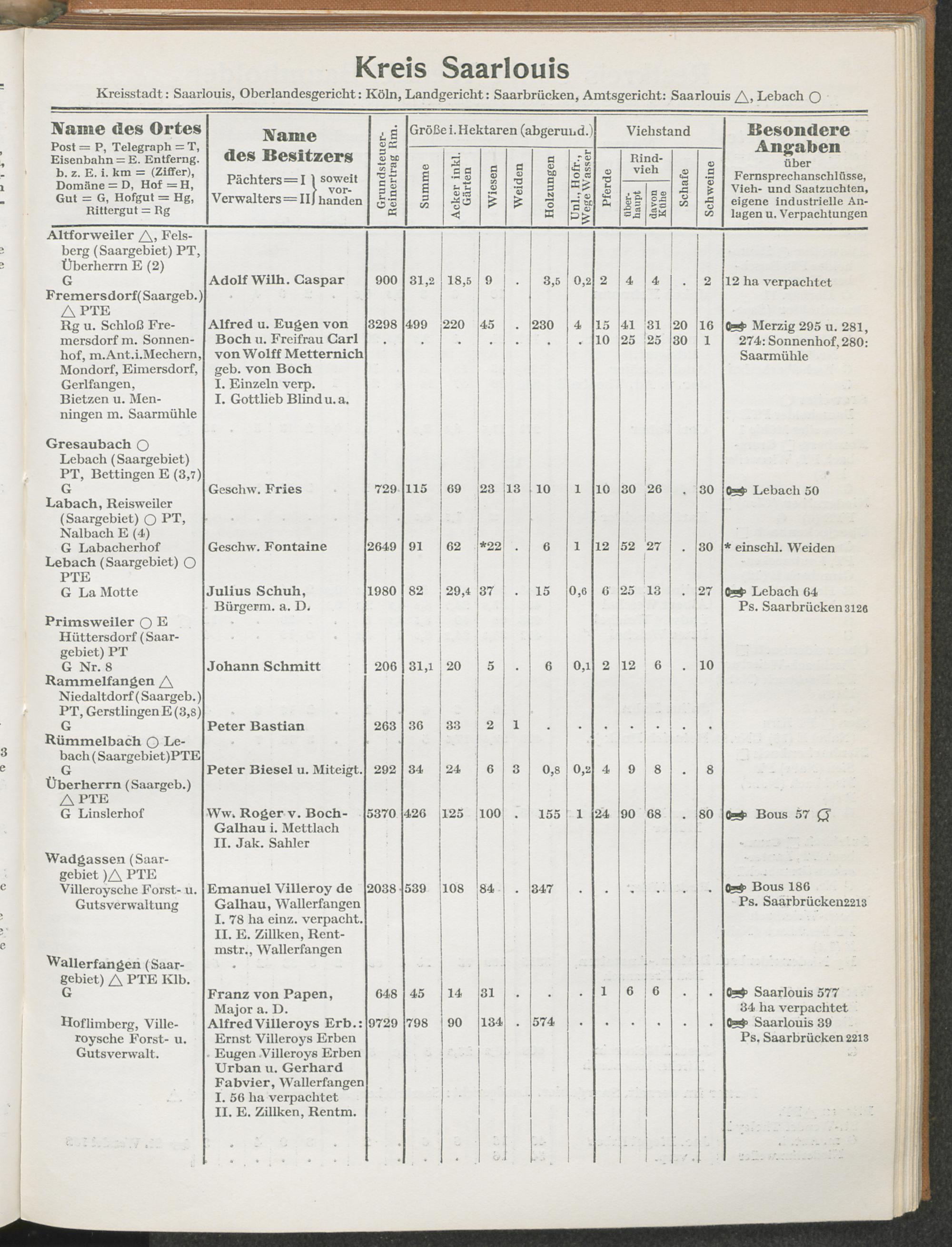 Landwirtschaftliches Adreßbuch der Rittergüter und Höfe der Rheinprovinz einschl. Landesteil Birkenfeld : Verzeichnis sämtlicher Rittergüter, Güter und Höfe von ca. 10 ha aufwärts mit Angabe der Gutseigenschaft, der Gesamtfläche und des Flächeninhalts der einzelnen Kulturen, des Viehbestandes, der eigenen industriellen Anlagen und Fernsprechanschlüsse, Angabe der Besitzer, Pächter und Verwalter, der Post-, Telegraphen- und Eisenbahnstationen und deren Entfernung vom Gute, der Land- und Amtsgerichte, einem alphabetischen Orts- und Personenregister, einem Verzeichnis der wichtigsten staatlichen Behörden und Dienststellen, der landwirtschaftlichen Vereine und Körperschaften und einer mehrfarbigen Landkarte im Maßstabe 1 : 1000000 / mit Unterstützung der landwirtschaftskammer zu Bonn a. Rh. nach amtlichen Quellen und auf Grund direkter Angaben bearb. von Ernst Seyfert und Hans Wehner ; mit einer Einleitung von Müller und Engels