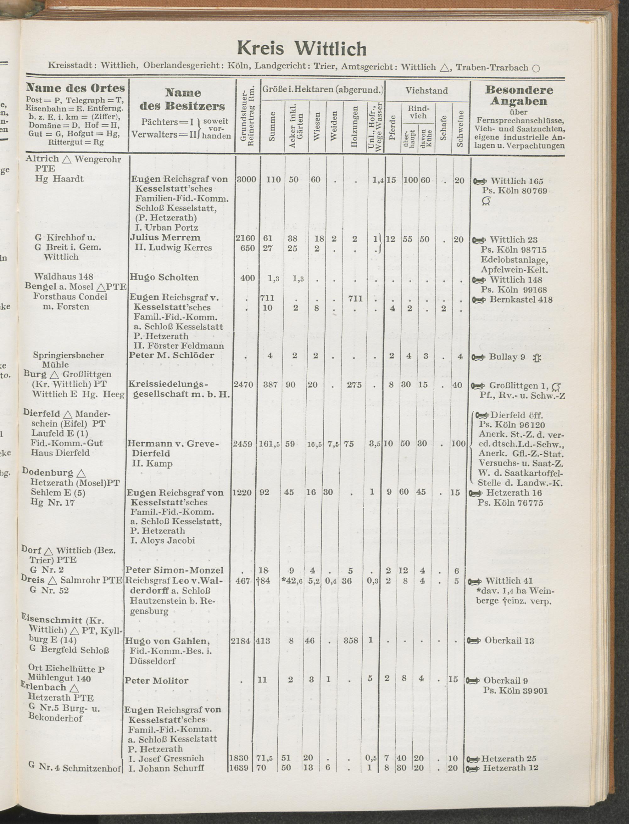 Landwirtschaftliches Adreßbuch der Rittergüter und Höfe der Rheinprovinz einschl. Landesteil Birkenfeld : Verzeichnis sämtlicher Rittergüter, Güter und Höfe von ca. 10 ha aufwärts mit Angabe der Gutseigenschaft, der Gesamtfläche und des Flächeninhalts der einzelnen Kulturen, des Viehbestandes, der eigenen industriellen Anlagen und Fernsprechanschlüsse, Angabe der Besitzer, Pächter und Verwalter, der Post-, Telegraphen- und Eisenbahnstationen und deren Entfernung vom Gute, der Land- und Amtsgerichte, einem alphabetischen Orts- und Personenregister, einem Verzeichnis der wichtigsten staatlichen Behörden und Dienststellen, der landwirtschaftlichen Vereine und Körperschaften und einer mehrfarbigen Landkarte im Maßstabe 1 : 1000000 / mit Unterstützung der landwirtschaftskammer zu Bonn a. Rh. nach amtlichen Quellen und auf Grund direkter Angaben bearb. von Ernst Seyfert und Hans Wehner ; mit einer Einleitung von Müller und Engels