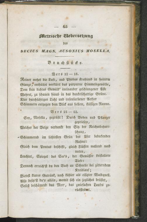 Metrische Uebersetzung des Decius Magn. Ausonius Mosella. Bruchstücke.