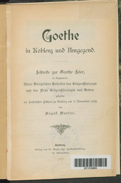 Goethe in Koblenz und Umgebung : Festrede zur Goethe-Feier in Gegenwart Ihrer Königlichen Hoheiten des Erbgroßherzogs und der Frau Erbgroßherzogin von Baden / gehalten von August Martini