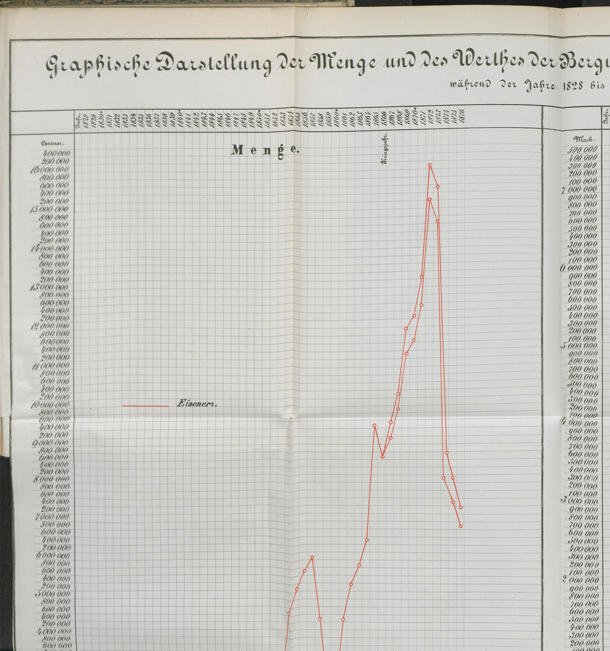Graphische Darstellung der Menge und des Werthes der Bergwerksproducte im Regierungsbezirk Wiesbaden während der Jahre 1828 bis 1876.