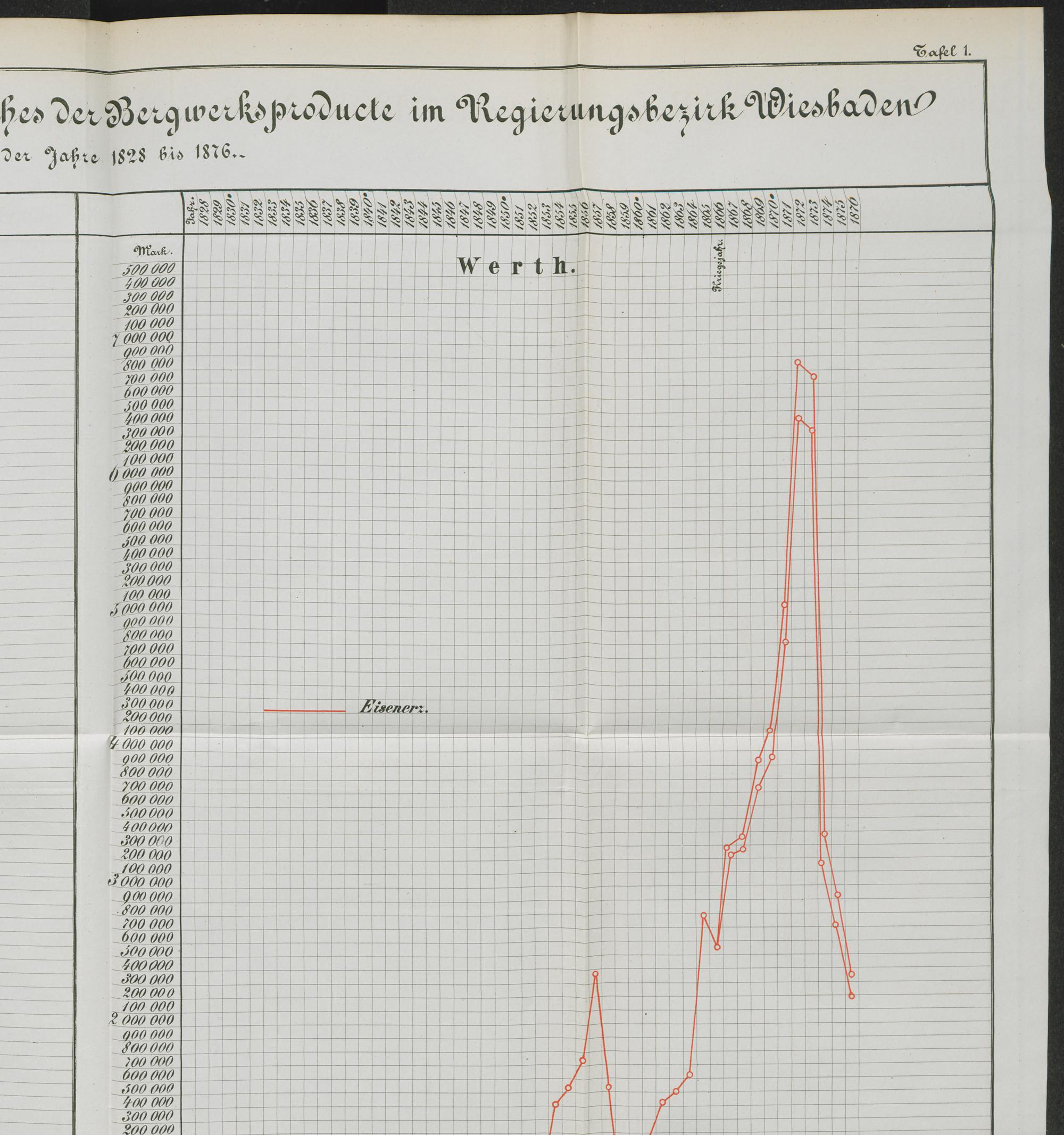 Graphische Darstellung der Menge und des Werthes der Bergwerksproducte im Regierungsbezirk Wiesbaden während der Jahre 1828 bis 1876.