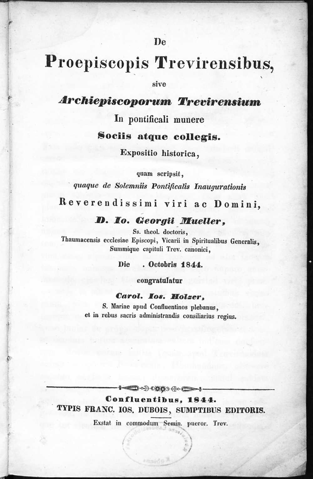 De Proepiscopis Trevirensibus, sive archiepiscoporum Trevirensium : in pontificali munere Sociis atque collegis / Carol. Ios. Holzer