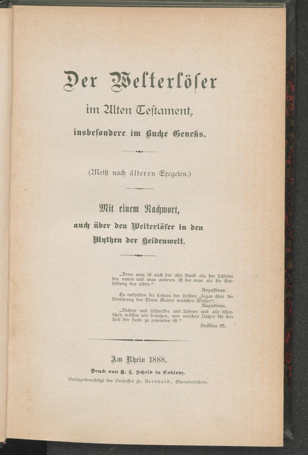 Der Welterlöser im Alten Testament, insbesondere im Buche Genesis : (meist nach älteren Exegeten) ; mit einem Nachw., auch über den Welterlöser in den Mythen der Heidenwelt / [Ver.: Franz Reinhard]