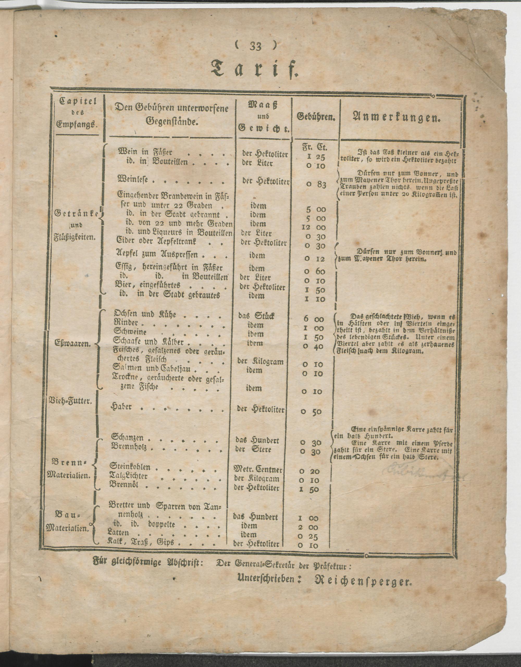 Réglement pour l'Octroi de la Commune d'Andernach. / Verordnung über das Octroi der Gemeinde Andernach.